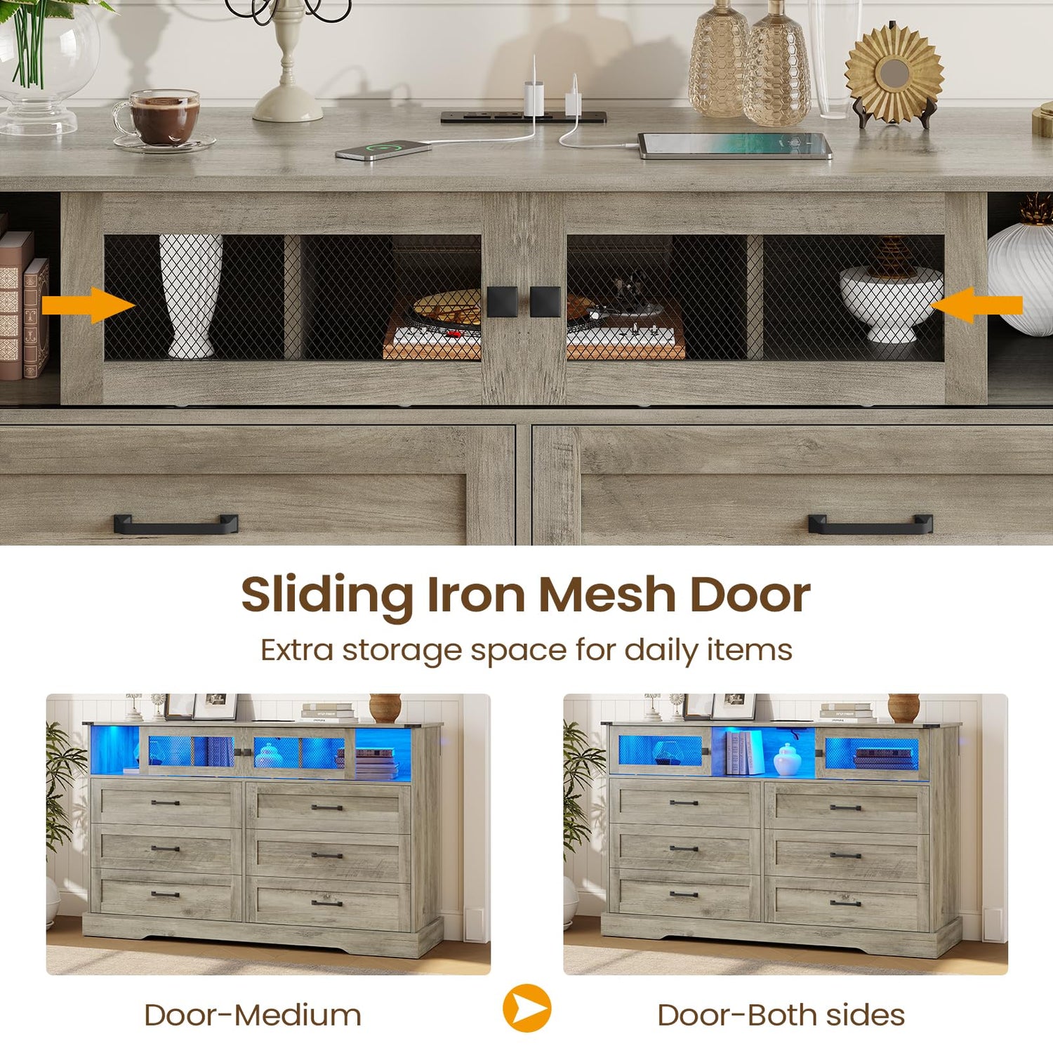 DICTAC Farmhouse 6 Drawers Dresser with Charging Station, LED Dresser with 2 Sliding Doors, Wood Wide Chest of Drawers, Storage Dressers Organizer for Bedroom, Living Room, Rustic Oak