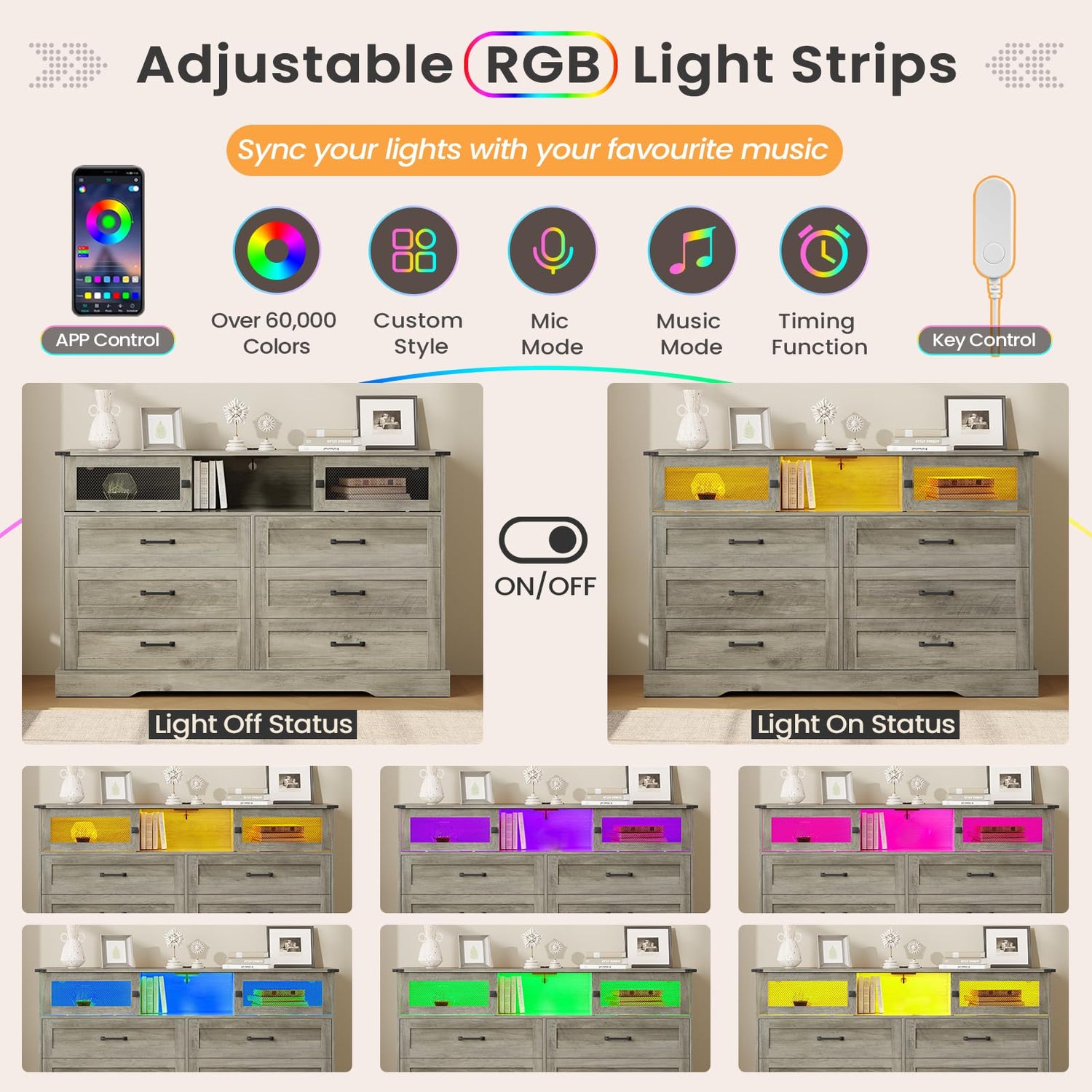 - Smarter LED Light: This Dresser comes with over 60000 colors of LED light. Freely adjust color, brightness, mode, and timing function via APP or remote. Lights flash different colors through the metal mesh, holding a party in your bedroom.