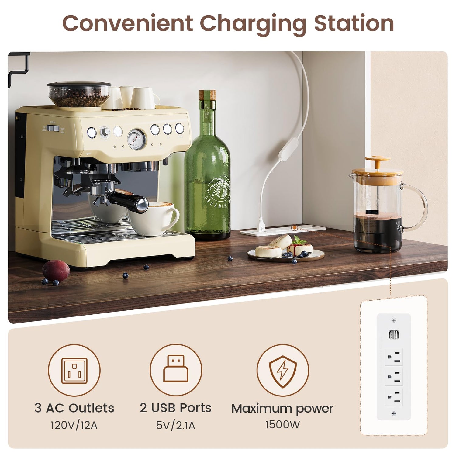 - 【Buffet Cabinet with Charging Station】Still worried about not having enough outlets in your coffee area or bar area? The top of this sideboard buffet cabinet has built-in power strips including 3 Outlets and 2 USB ports which help you easily power your small appliances like microwaves, ice makers, and coffee machines, juicers, adding more convenience to your daily life.