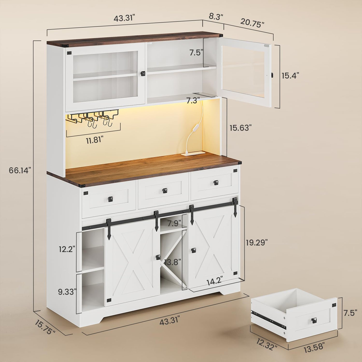 - 【Ample Storage Space】This kitchen hutch provides a versatile storage solution, featuring a designated coffee bar and upper cabinets. The upper storage cabinet offers 4 compartments with doors. The middle section has a spacious countertop,3 goblet racks and 4 hooks.The bottom coffee bar includes 3 large drawers,1 open storage space, X-shaped wine bottle rack and 4 hidden shelf spaces with sliding barn doors, providing plenty of space to store your coffee maker, microwave oven, and favorite wine, beverages, glassware, and bar accessories.