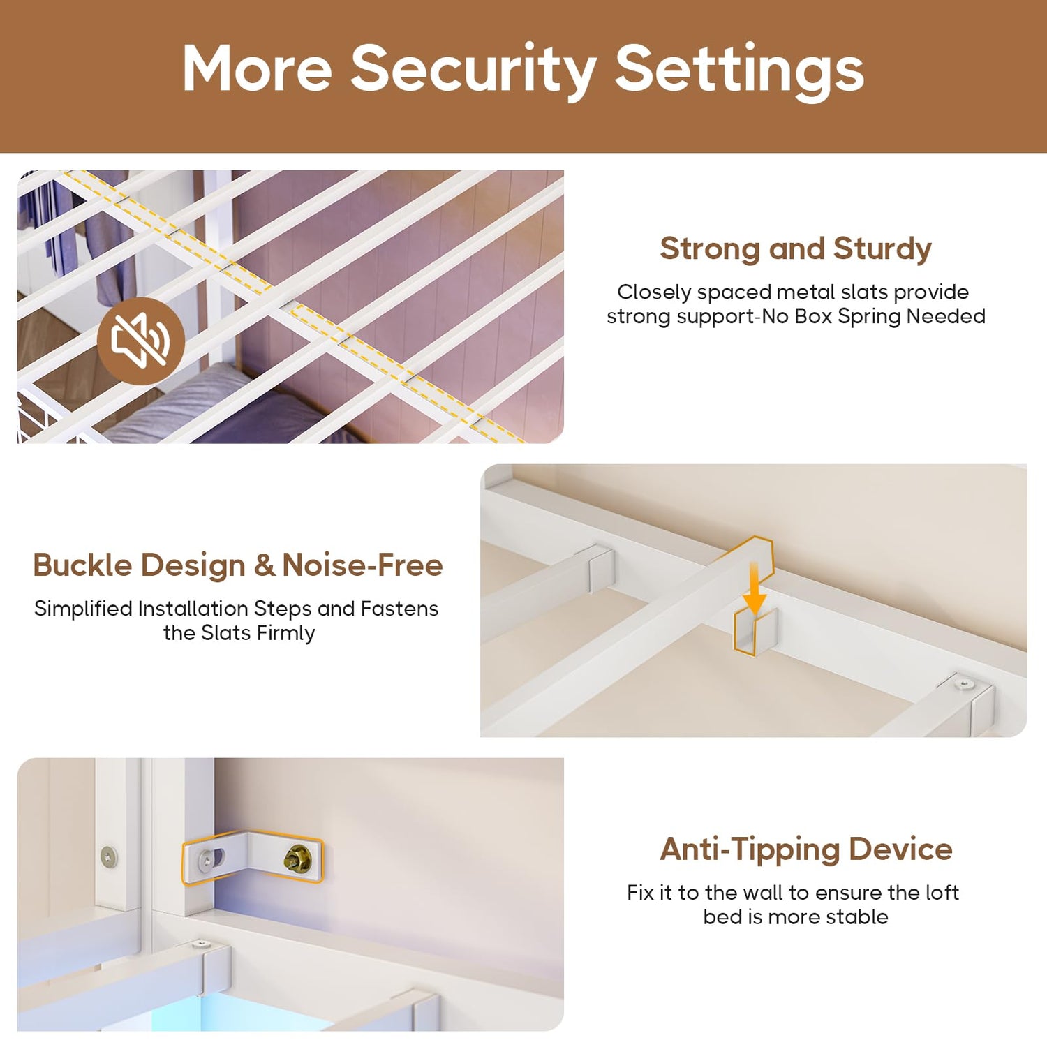 - 【Sturdy Construction & No Noise】The bunk bed frame features a stronger square heavy duty metal frame structure and closely packed metal slats to ensure the full over twin loft beds security and stability. The lower bunk supports up to 400 lbs and the upper bunk supports up to 450 lbs.No Box Spring is Needed.The slats are firmly fixed to the metal frame with buckle design, preventing noise when the slats move and ensuring an immersive sleep experience.