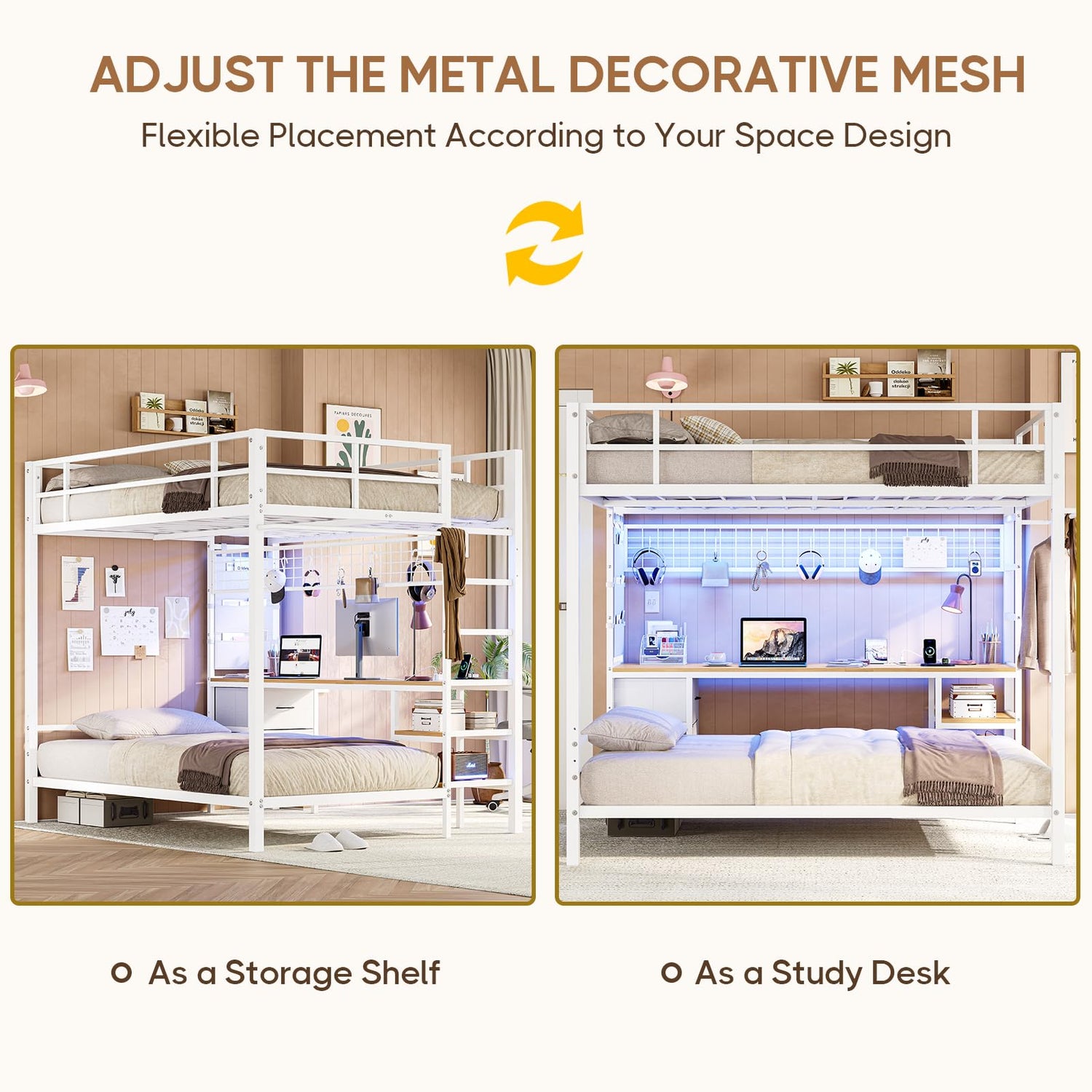 - 【Bunk Bed with Desk and Outlets】DICTAC full/twin bunk bed comes with a study desk and charging station. While satisfying rest, create a productive, simple work, study or gaming area for your child, ideal for adults and teens. You can also move the metal mesh to the outside,and then put the side with the metal mesh against the wall, and turn the desktop into a bookshelf, or still use it as a study table, so you can study or work while sitting on the bed. Perfect for space-saving needs.