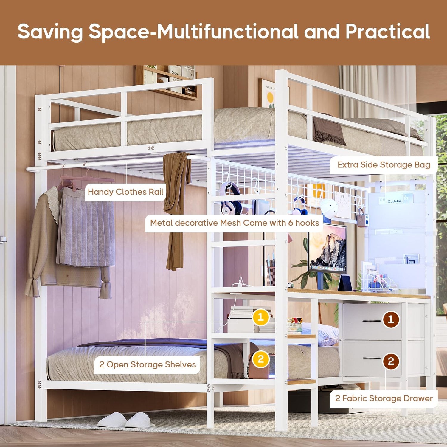 - 【Multifunctional Storage Design】DICTAC bunk bed full/twin with practical storage space includes 2 open storage shelves,2 fabric drawers and an extra side storage bag to expand your use space.The metal decorative mesh has 6 hooks, suitable for hang headphones, keys, hats,etc.DIY iron mesh as a photo wall to decorate your small space.The hanging rail on the left side of the loft bed provides a convenient place to hang up the hangers,scarves,or the clothes you take off after the day out.