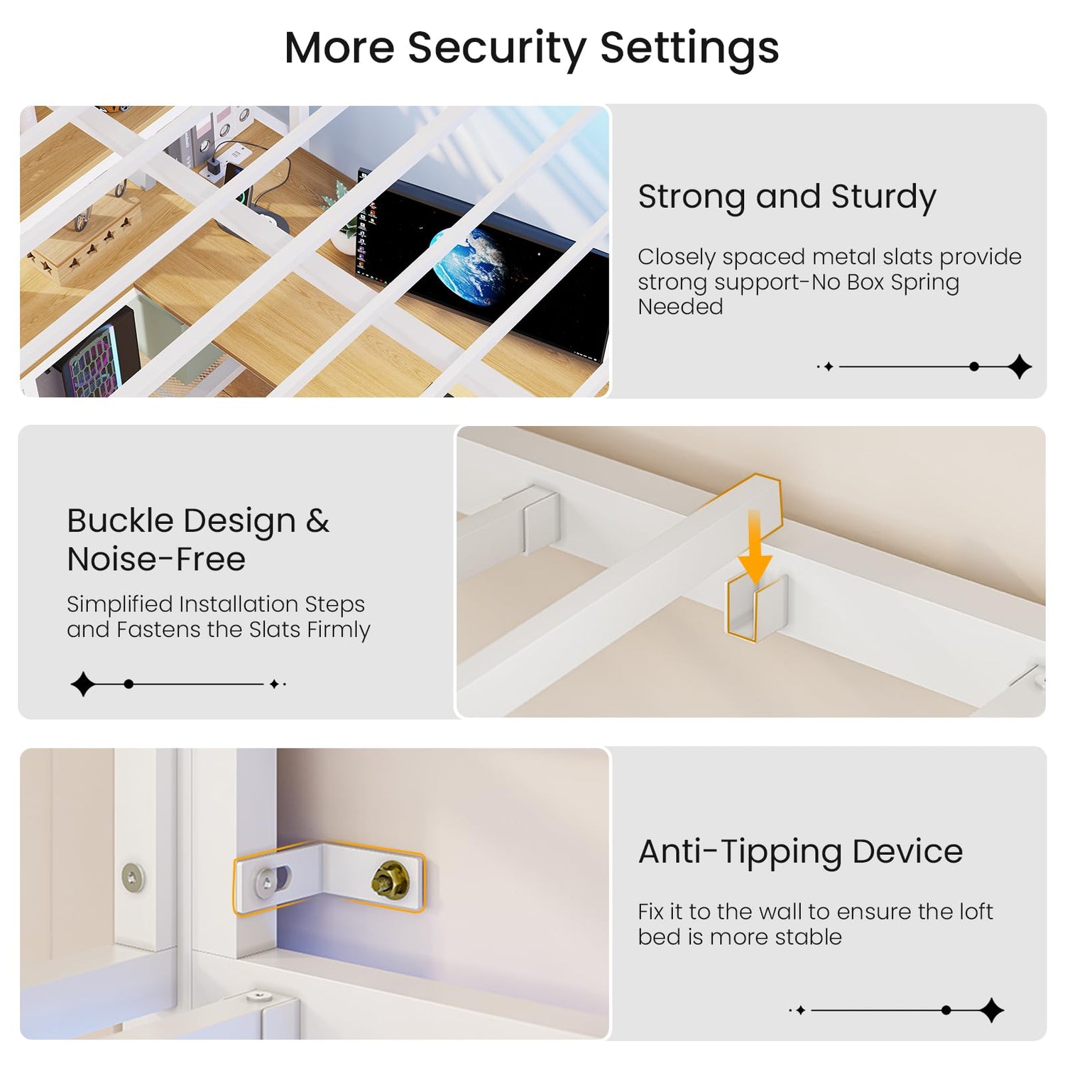 - 【Sturdy and Durable】Adopt a stronger heavy coated sSteel square tube that includes closely packed metal slats and metal frame structure to provides strong support for the mattress.Each component is securely secure with heavy-duty screws and tested to ensure the full loft bed security and stability.No Box Spring is Needed.