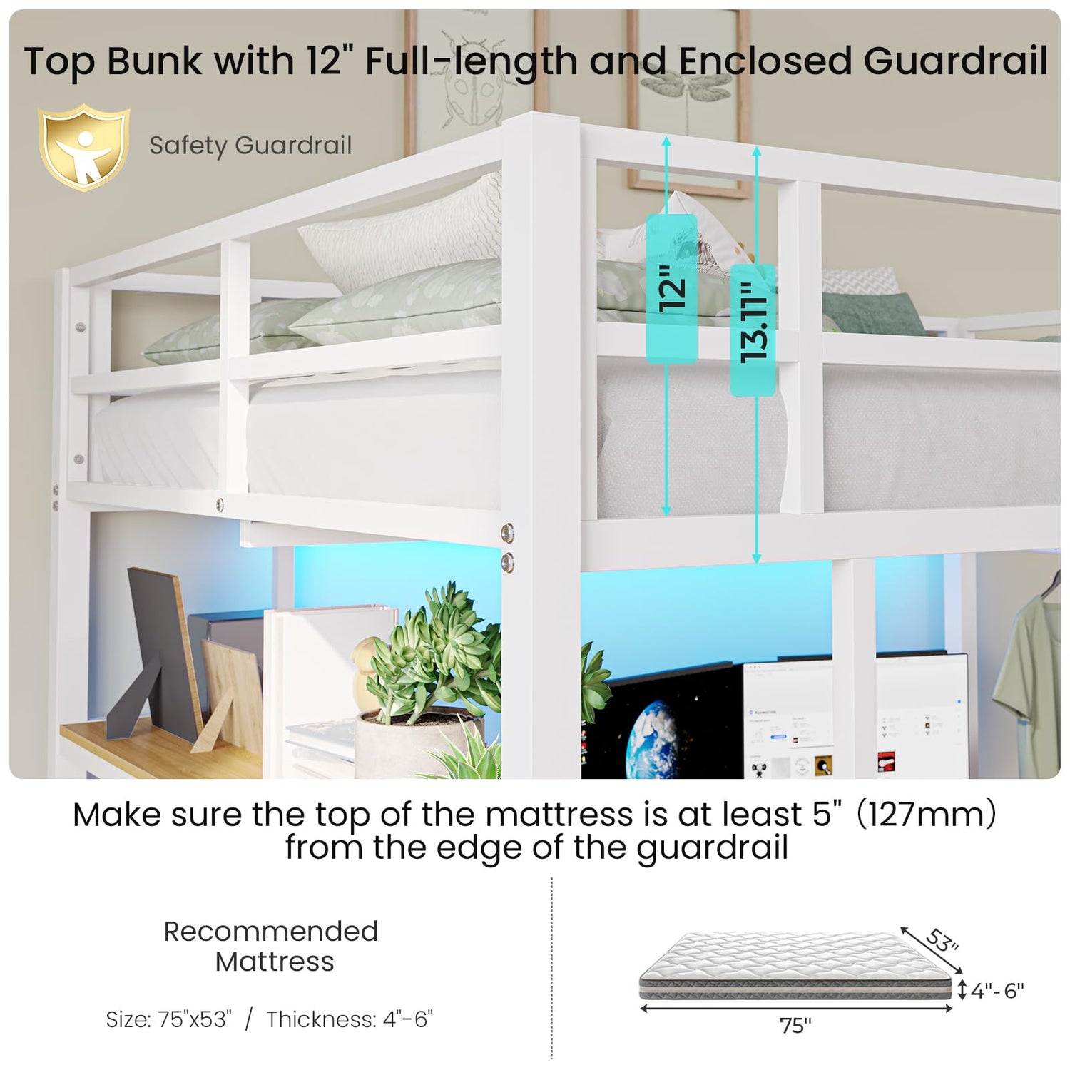 - 【Safety Guaranteed】The top bunk is equipped with full-length and heightened guardrails which not only stabilize the structure of the full loft bed but more importantly, provide maximum security to protect your safety. In addition, we provide sturdy metal anti-tip nails to firmly fix the loft bed to the wall for added safety and create a quiet and safe sleeping environment.
