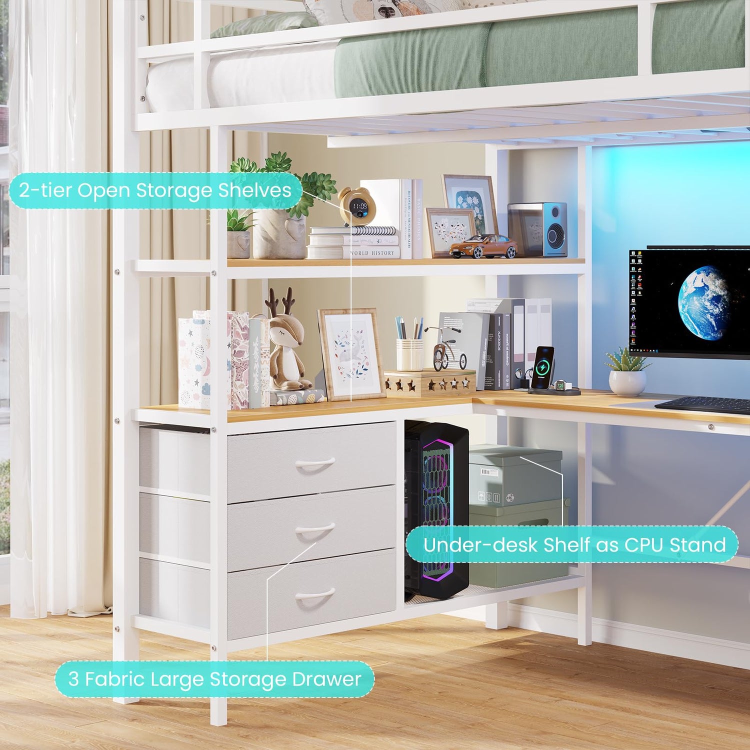 DICTAC Full Size Loft Bed with L-Shaped Desk, LED Lights and Charging Station Full Metal Loft Bed Frame with 3 Storage Shelves & 3 Fabric Drawers,Loft Beds with Top Bunk -Safety Guard & Ladder,White