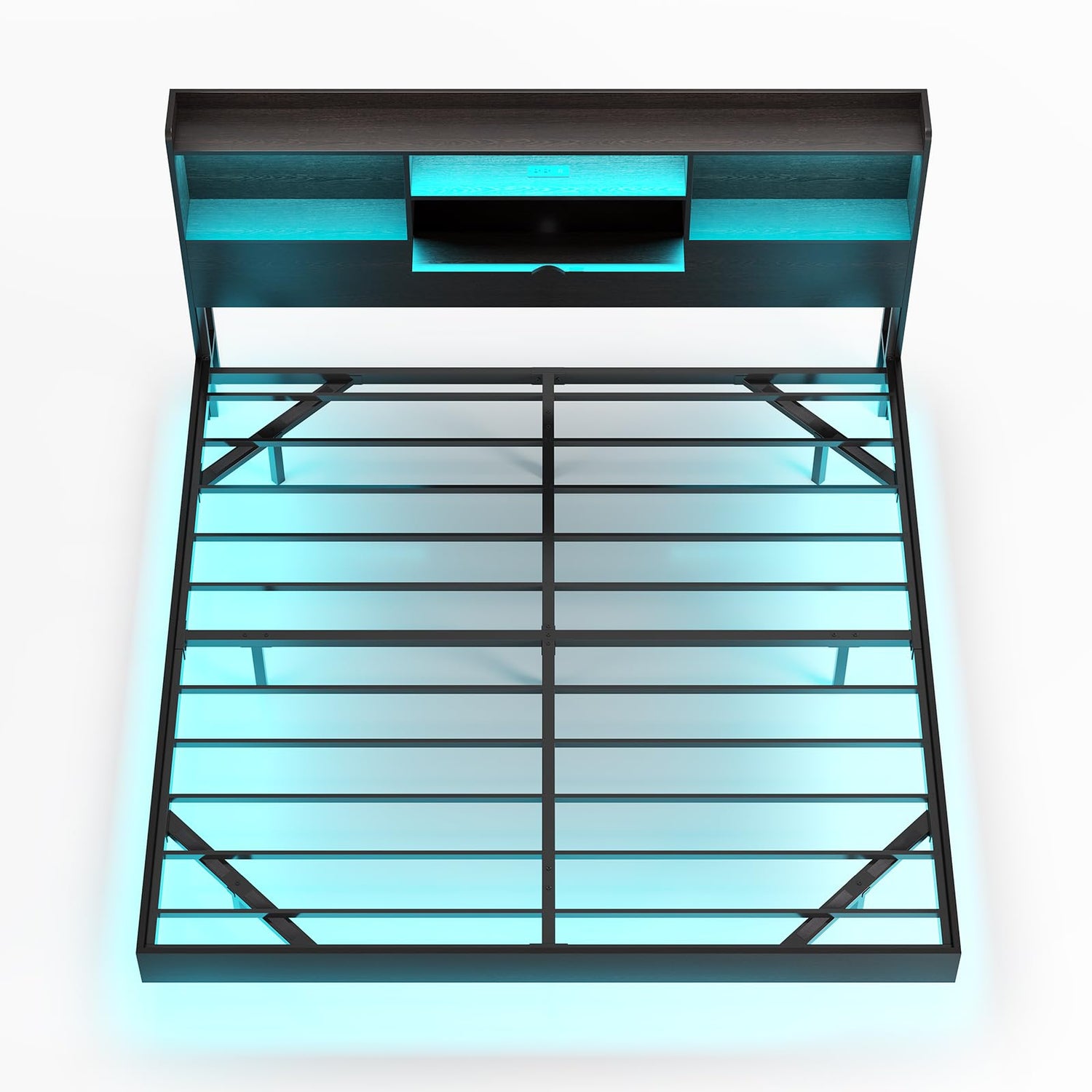 DICTAC King Floating Bed Frame with LED Lights and Headboard Storage, Visual Floating Bed with Charing Station, King Size Metal Platform Bed with Stable Structure, No Box Spring Need, Easy Assembly