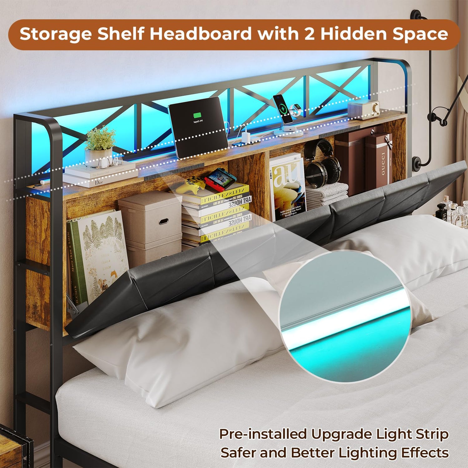 The practical storage headboard is designed for modern living. It includes a built-in power strip featuring two standard plug outlets, one Type-C port, and one USB port, making charging your devices a breeze. No more scrambling to find your charger—you’ll have everything within easy reach.