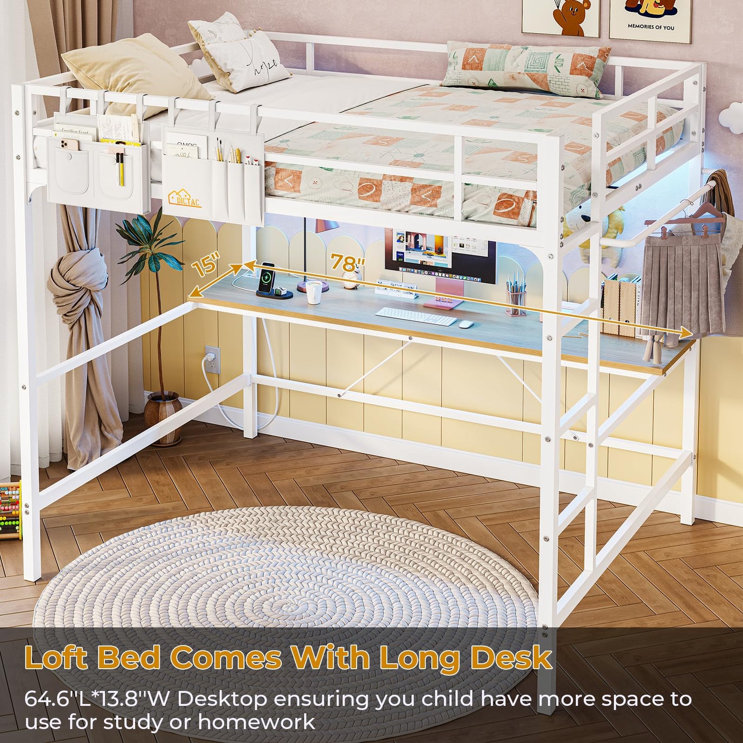 DICTAC Loft Bed Full Size with Desk and Led Lights Metal Full Loft Bed with Power Outlet Full Size Bed Frame with Top Bunk and Safety Guard & Ladder, Space-Saving,No Noise,No Box Spring Needed, White