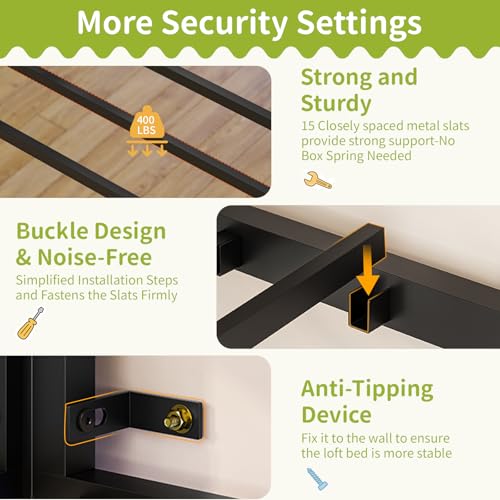- 【Sturdy and Stable】Our low loft bed adopt a stronger heavy coated steel square tube that includes 15 closely spaced metal slats and metal frame structure.Each component is securely secure with heavy-duty screws and tested to ensure the full loft bed security and stability.No Box Spring is Needed.In addition, we provide sturdy metal anti-tip nails to firmly fix the bunk bed to the wall for create a quiet and safe sleeping environment.