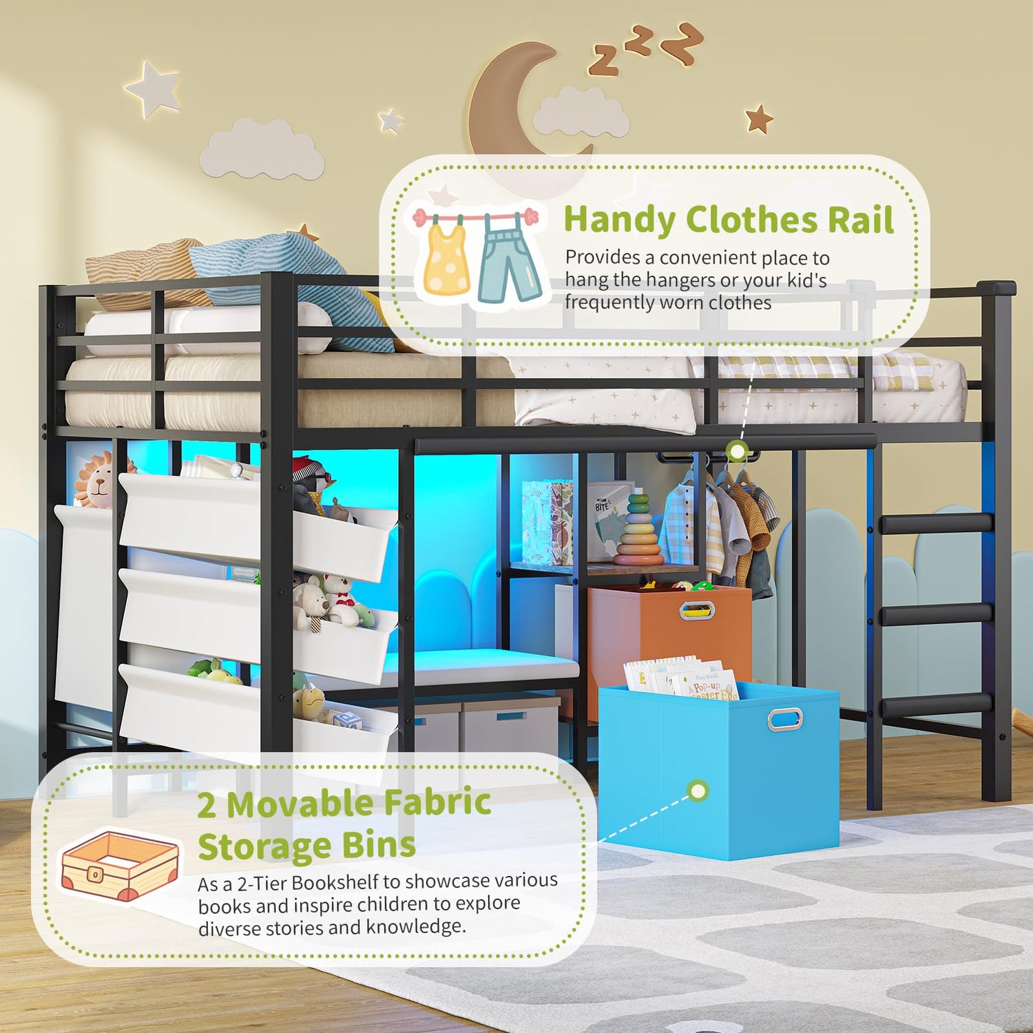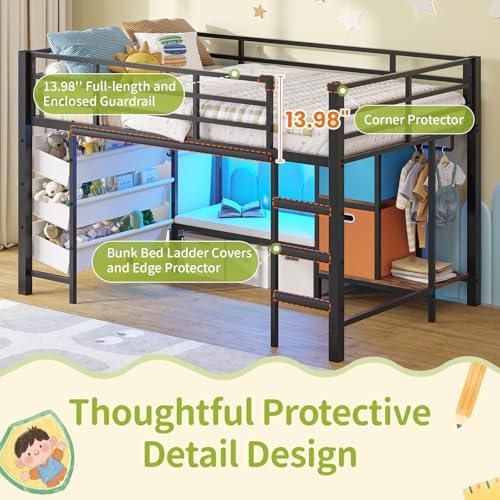 DICTAC Low Twin Loft Bed with Reading Corner,3 Sling Drawers and 2 Movable Storage Bins,Metal Twin Size Loft Bed for Kids with LED Lights and Storage Basket,13.98" H Safety Guardrail & Stairs, Black