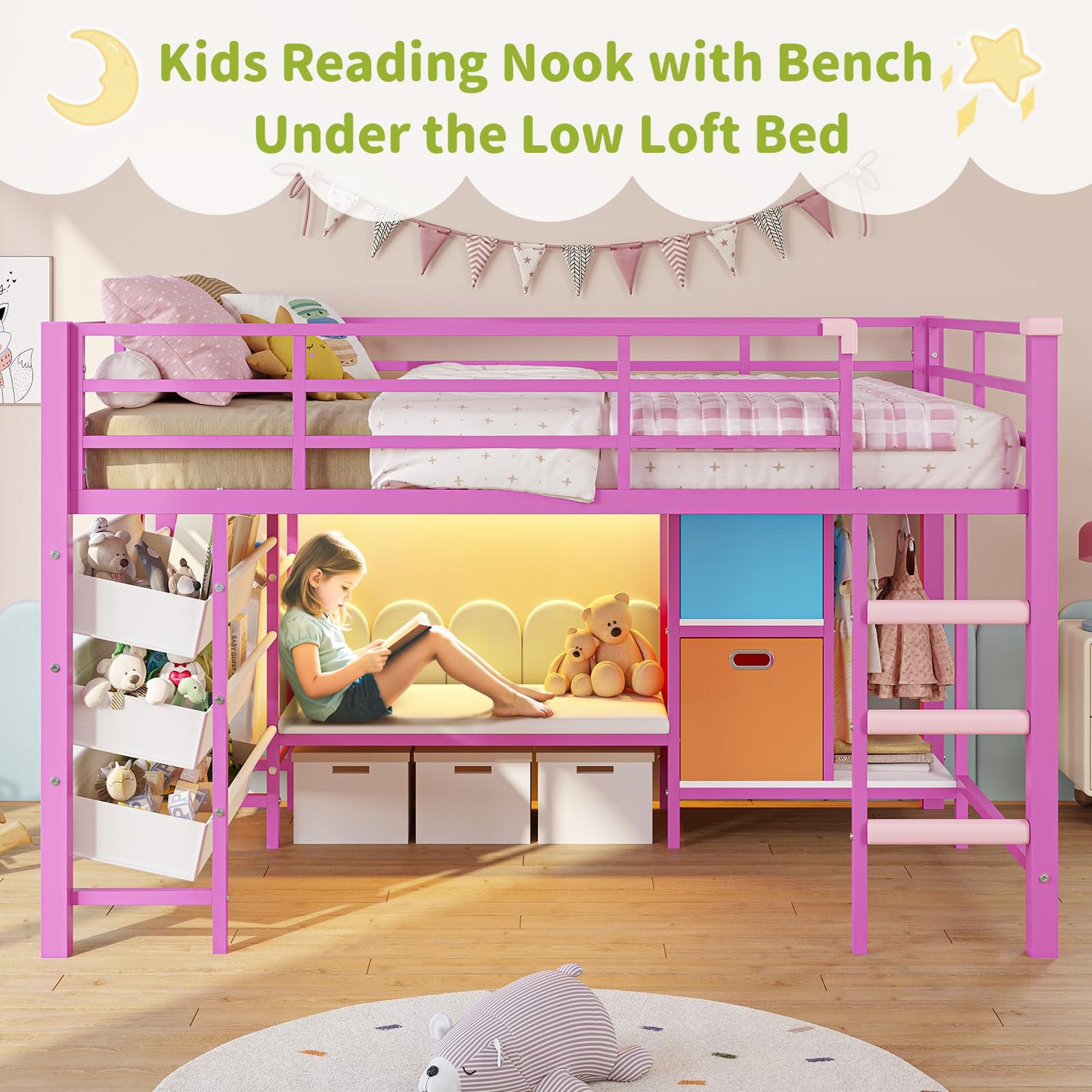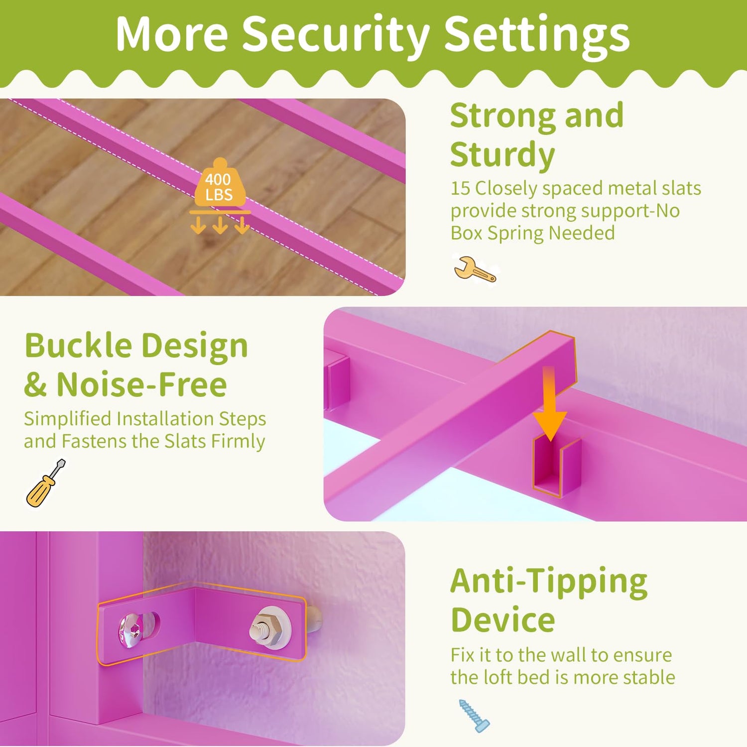 - 【Sturdy and Stable】Our pink loft bed adopt a stronger heavy coated steel square tube that includes 15 closely spaced metal slats and metal frame structure.Each component is securely secure with heavy-duty screws and tested to ensure the full loft bed security and stability.No Box Spring is Needed.In addition, we provide sturdy metal anti-tip nails to firmly fix the bunk bed to the wall for create a quiet and safe sleeping environment.
