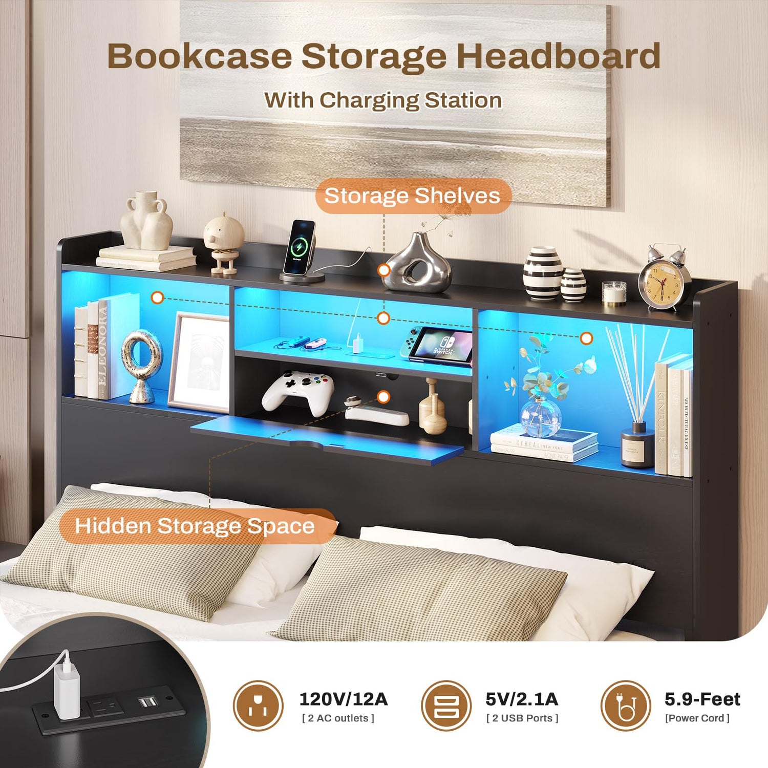 - 【Practical Storage Space】The bookcase headboard with 2 tier storage, Includes the top open display layer, the second layer has three spacious open compartments, and one hidden compartments. Perfect for organizing your bed rest essentials like alarm clocks, books, glasses, picture frames and other commonly used small items. The under-bed storage space is easy to collect luggage, shoe cases, and some storage boxes and the sweeping robot can easily pass through and keep your bedroom clean and tidy.