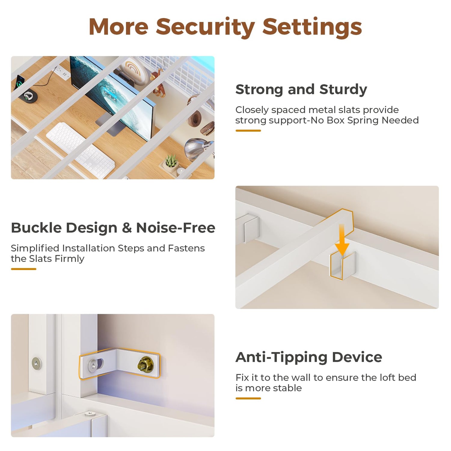 - 【Safety Comes First】Adopt a stronger square metal frame structure,each component is securely secure with heavy-duty screws and tested to ensure the twin loft beds security and stability. Enjoy peace of mind with a 13.11" heightened full-length safety guardrail and metal Anti-Tipping Nails(to securely fasten the loft bed to the wall) for added safety, don't worry about falling out of the bed while sleeping.