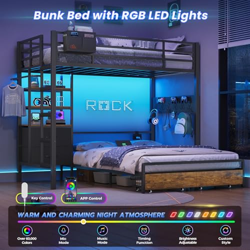 - 【Magic RGB LED Lights 】DICTAC twin over full bunk beds with led lights is not only a place to sleep, but also a dream space for children to explore creativity and have fun. The RGB light color brightness and flashing mode can be controlled through the APP, making the secret base full of fun and vitality.And the warm light also provides a sense of security and companionship for children.