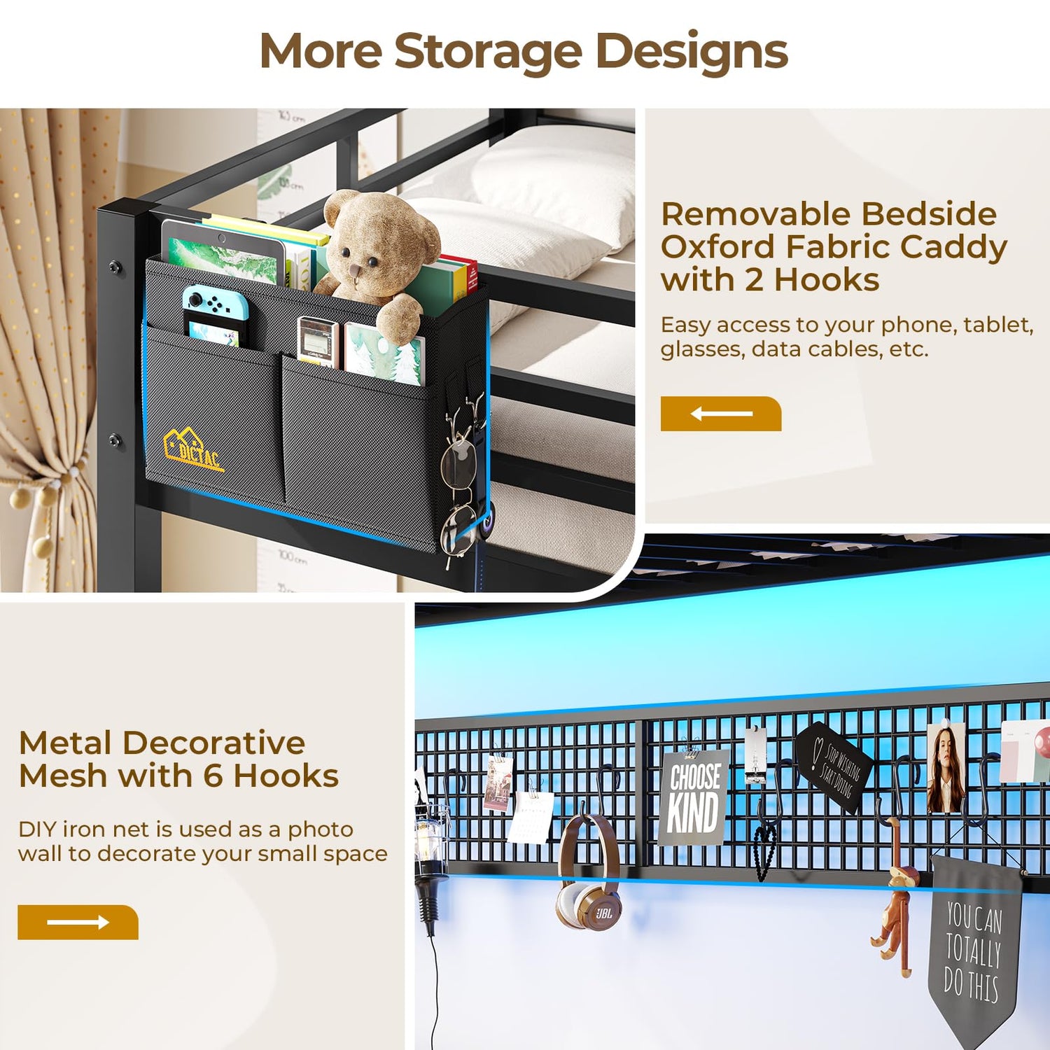 • 【Multiple Ways to Use Space】DICTAC bunk bed with a bedside caddy with 2 hooks for hanging on the upper bunk to keep your phones, tablets, glasses, data cables, headphones, and TV remotes close to you for easy retrieval. The metal decorative mesh with 6 hooks,DIY iron mesh as a photo wall to decorate your small space. And the absence of a box spring,creates14'' of vertical storage space underneath the lower beds to saving space.