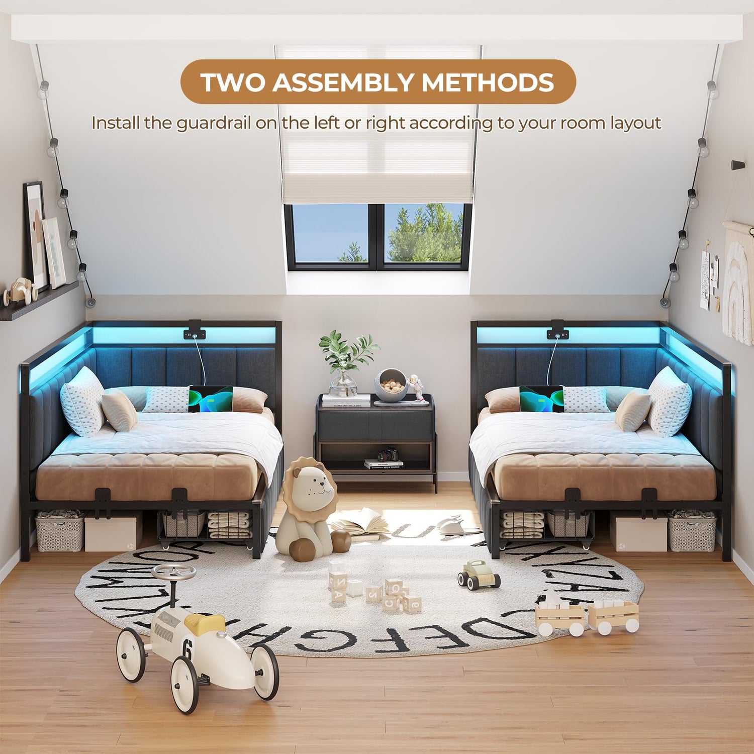 DICTAC Twin Size Bed Frame with 2 Storage Drawers & Charging Station twin Platform Corner Bed Frame with Led Lights Twin Daybed With Upholstered Guardrail for Living Room, Bedroom and Guest Room, Gray