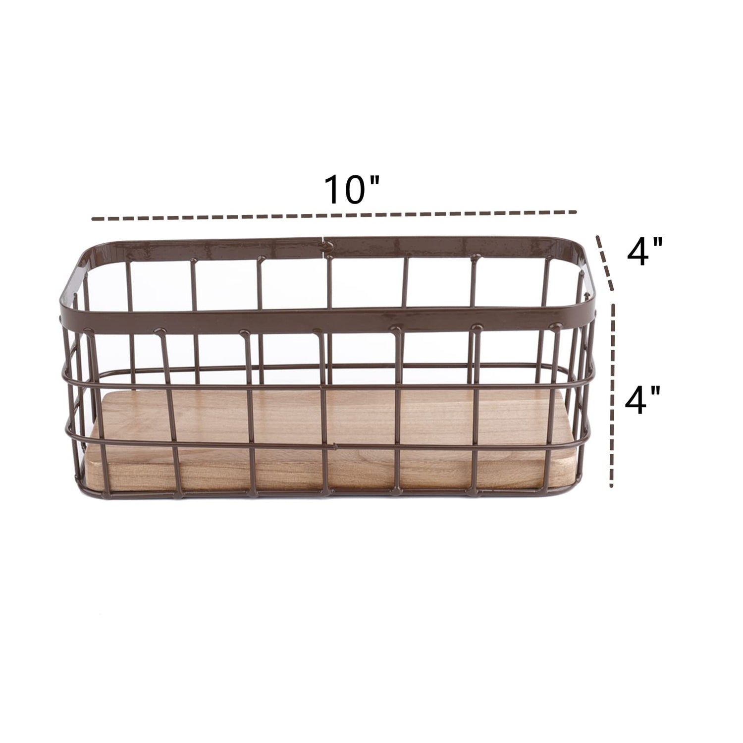 Details: Dicunoy Set of 2 Metal Wire Baskets, Rustic Narrow Storage Basket, Farmhouse Style Organizer Bin Tray Package: 2 x narrow metal wire baskets Metal storage basket size: 10" L X 4" W X 4" H. Features: Made of premium sturdy iron frame and wood base. The metal mesh is sleek and solid. Wood bottom prevents fall-through of smaller items. Sturdy construction, difficult to be deformed and lasts a long time. The neat iron mesh hollow design, modern and simple style will be suitable for any home style and space. The small size is easy to place and to be easily carried around the room. These baskets are a great size for countertop storage to keep things organized