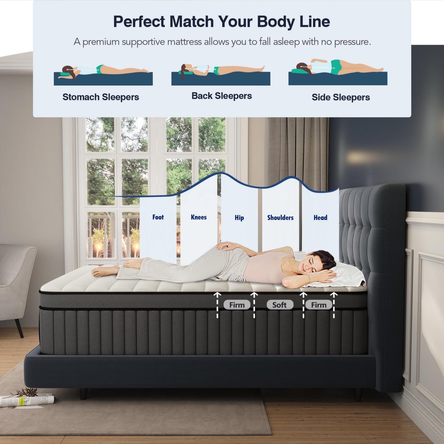 - Targeted Pressure Relief for Bodies — Queen memory foam mattress contours to your body for targeted pressure relief. The unique memory foam layer makes this mattress queen alleviates pressure points, reducing back pain. The hybrid design blends comfort and support, ensuring you wake up feeling rejuvenated. Queen size memory foam mattress bringing you with exceptional comfort