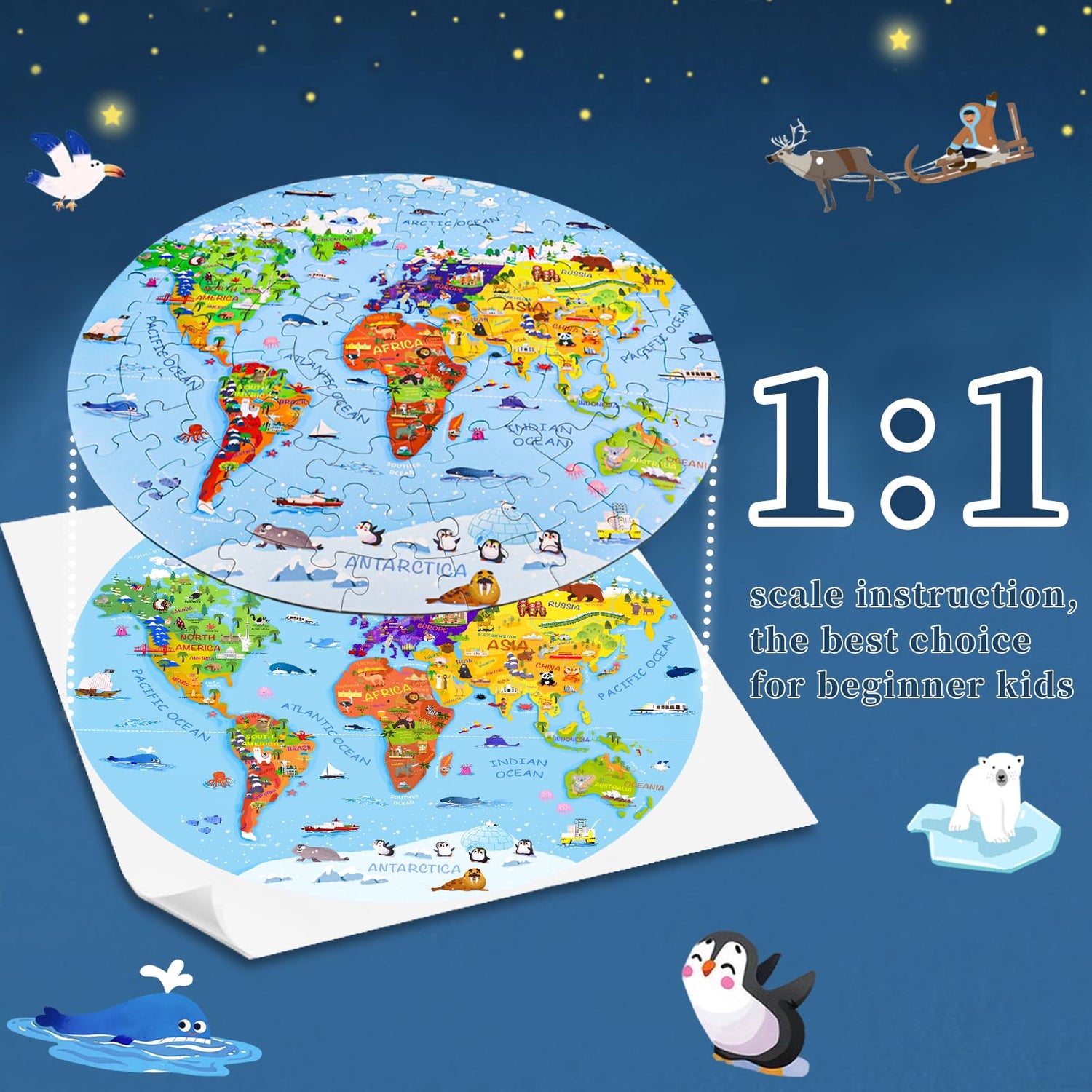 - 【Package and Size】70 pieces round world map puzzles, the total size is 22.8*22.8 inch, each piece has a unique shape and the size is 3.58*2.28 inch, the design of large pieces is easier for kids to identify and grasp. Comes with a delicate gift, convenient to organize and store puzzles, not easy to lose.