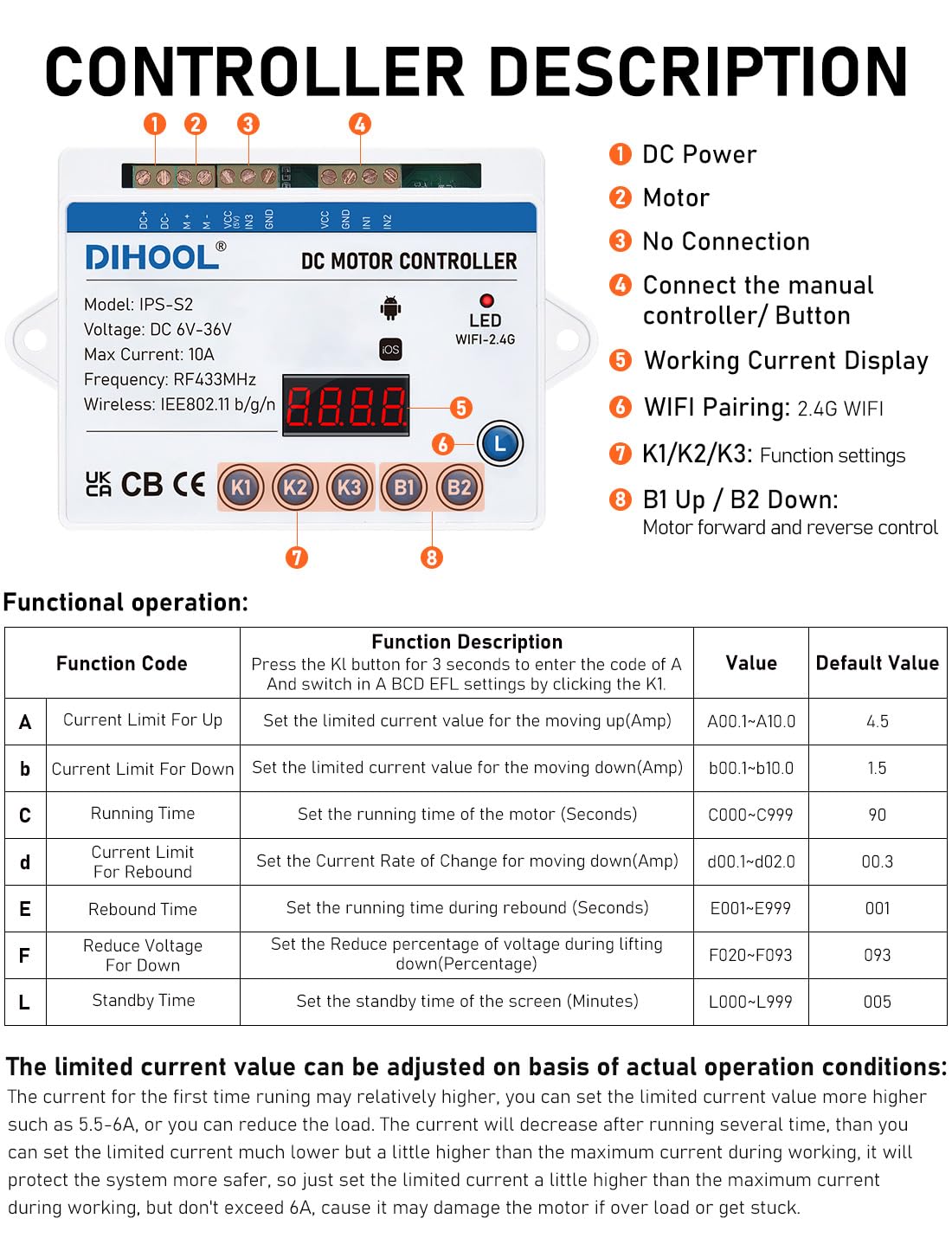 - Four options for operating: 1.The button on the IPS-S2 controller (B1-UP, B2-DOWN); 2.Wired Handle button length up to 2.5m(if you need the pedal button, you can buy from Bundles); 3.The eWelink APP (download from the APP or Android Store) ;4.The wireless remote