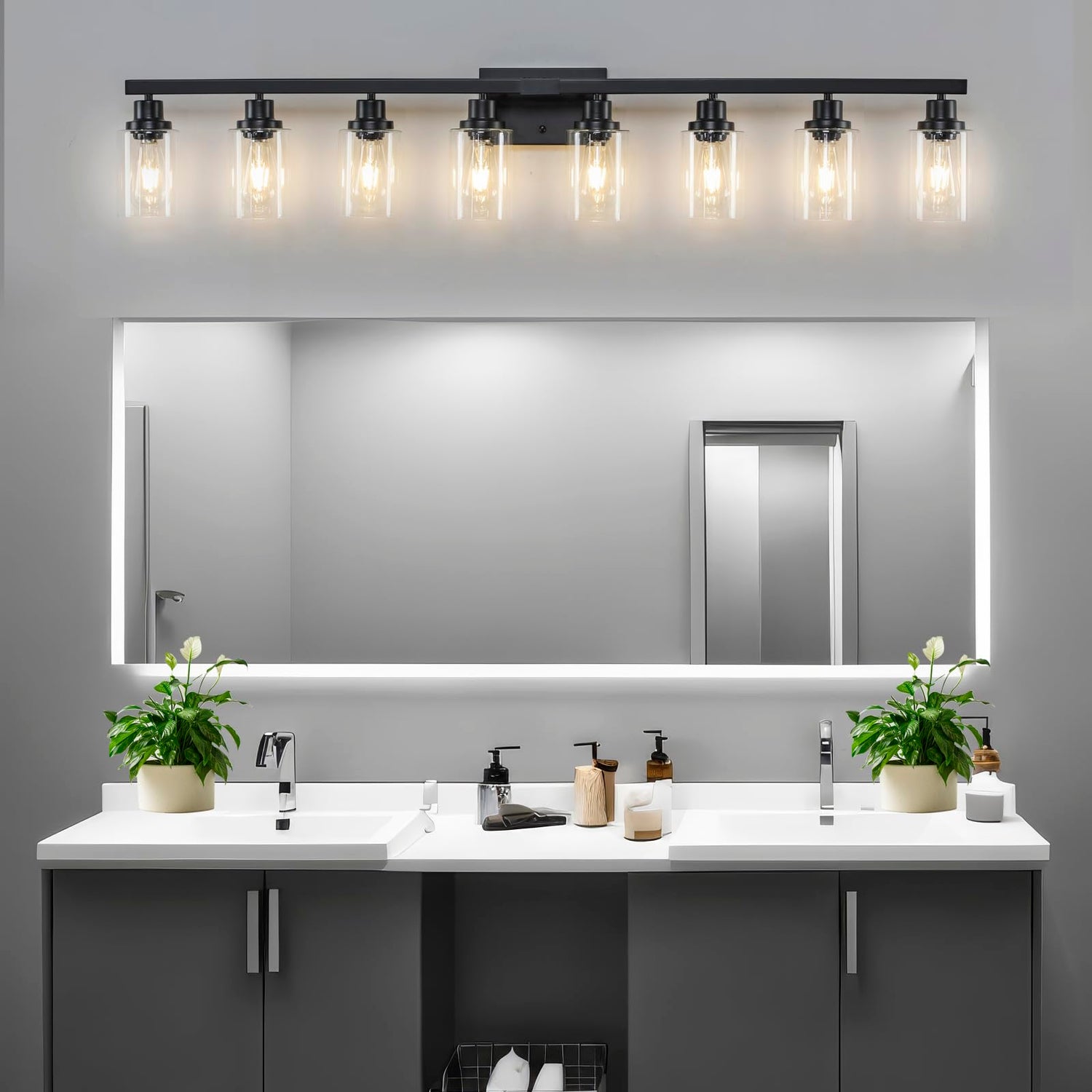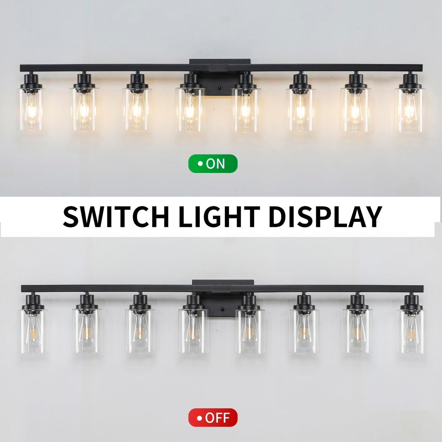 - Sturdy Metal Construction: 8-Light Bathroom lighting fixture is made of sturdy metal in a matte black finish with no need to worry about oxidation and color fading. Additionally, High-quality clear glass shades will protect the bulb maximize its light, and increase the classic ambiance in any space. The bathroom vanity light perfectly fits any style. It will bring more exquisite and luxury to your home lighting