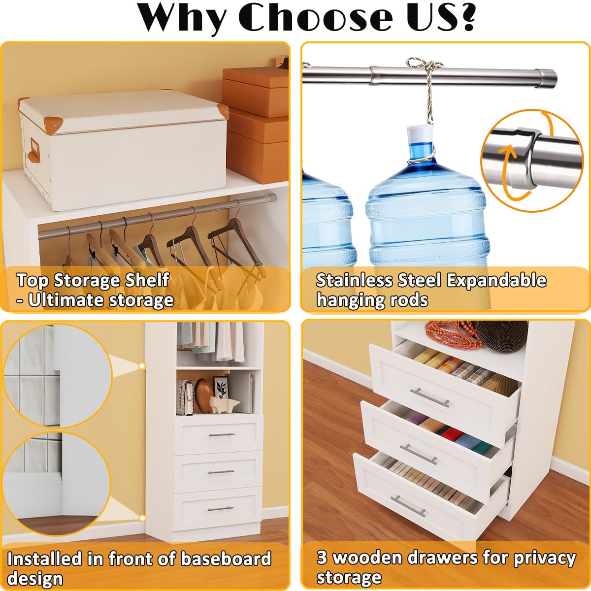 - 【Multi-Functional Closet System】This closet system offers a custom, spacious solution for organization and storage. 1 inner short expandable hanging rods for organizing T-shirts, jackets, coats, and outerwear. 1 longer expandable hanging rods side using for exband hanging area for long skirts, dresses. 3 independent wood drawers for discreet storage of undergarments and personal items. The top area keeps storage boxes organized and easily accessible. This versatile closet system is perfect living room, laundry room or entryway as a storage cabinet etc.