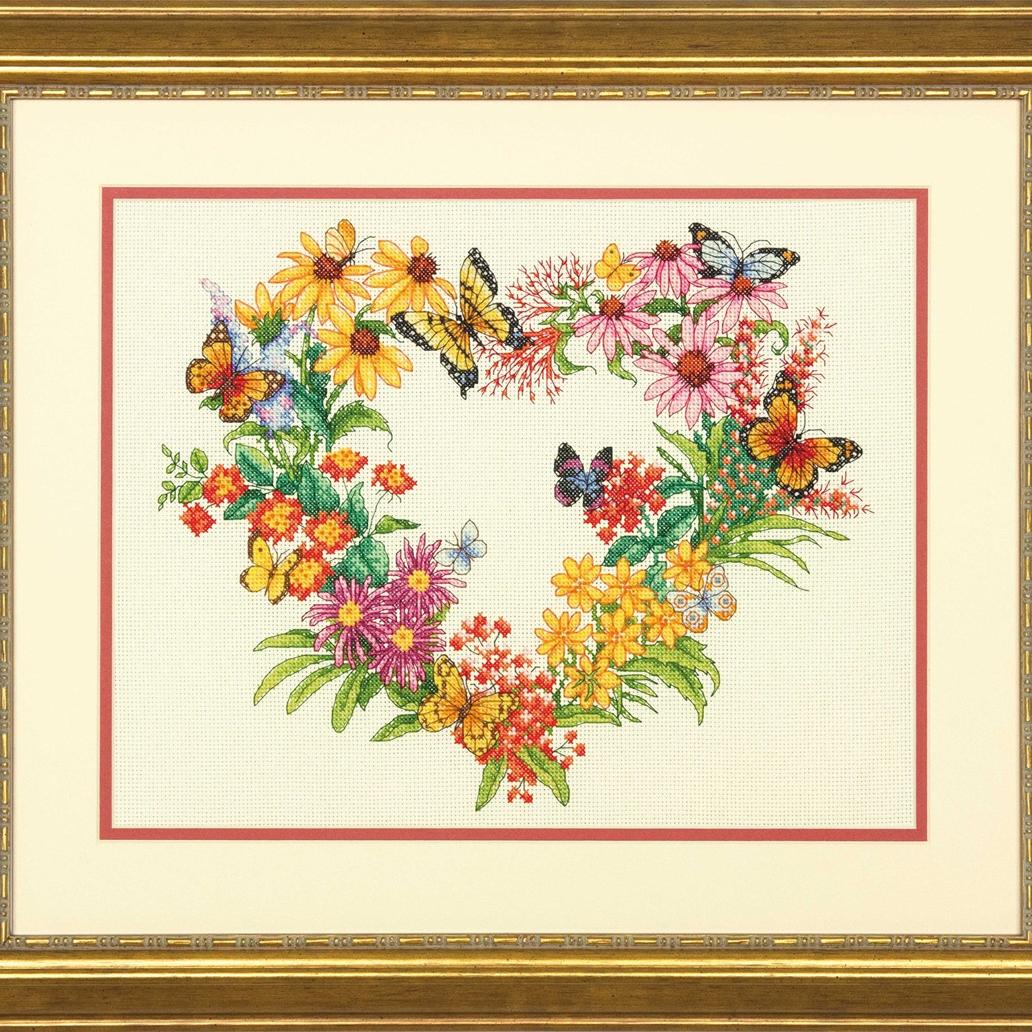 - Bring the essence of the summer season into your home with this cross stitch pattern that features a beautiful heart-shaped flowers wreath and colorful butterflies