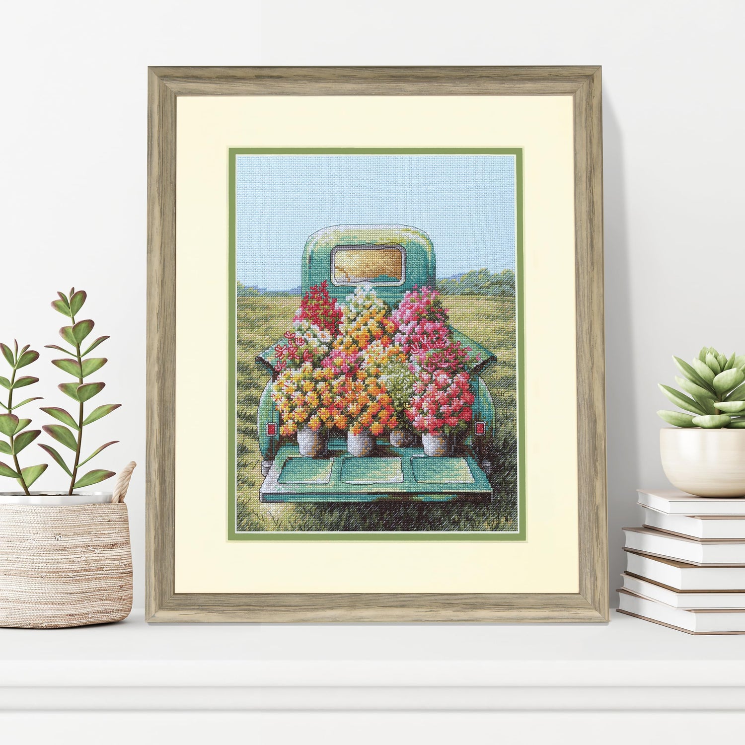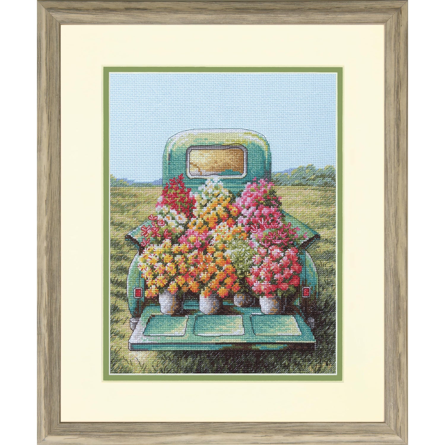 Details: Take your pick of these lovely flowers! A farmer has pulled his vintage truck out into the field and he's ready to sell you something beautiful. This cross stitch design from Dimensions is perfect for any gardening enthusiast. All Dimensions cross stitch kits include an easy-to-follow chart and key, detailed stitch diagrams, and a large color image of finished design for reference as you stitch. This counted cross stitch pattern is best suited to intermediate skill levels. This counted cross stitch set contains presorted thread, 14 count lt. blue Aida, needles, and instructions. Completed pattern measures 9" x 12". Design copyright Dee Dee, License granted by Penny Lane Publishing.