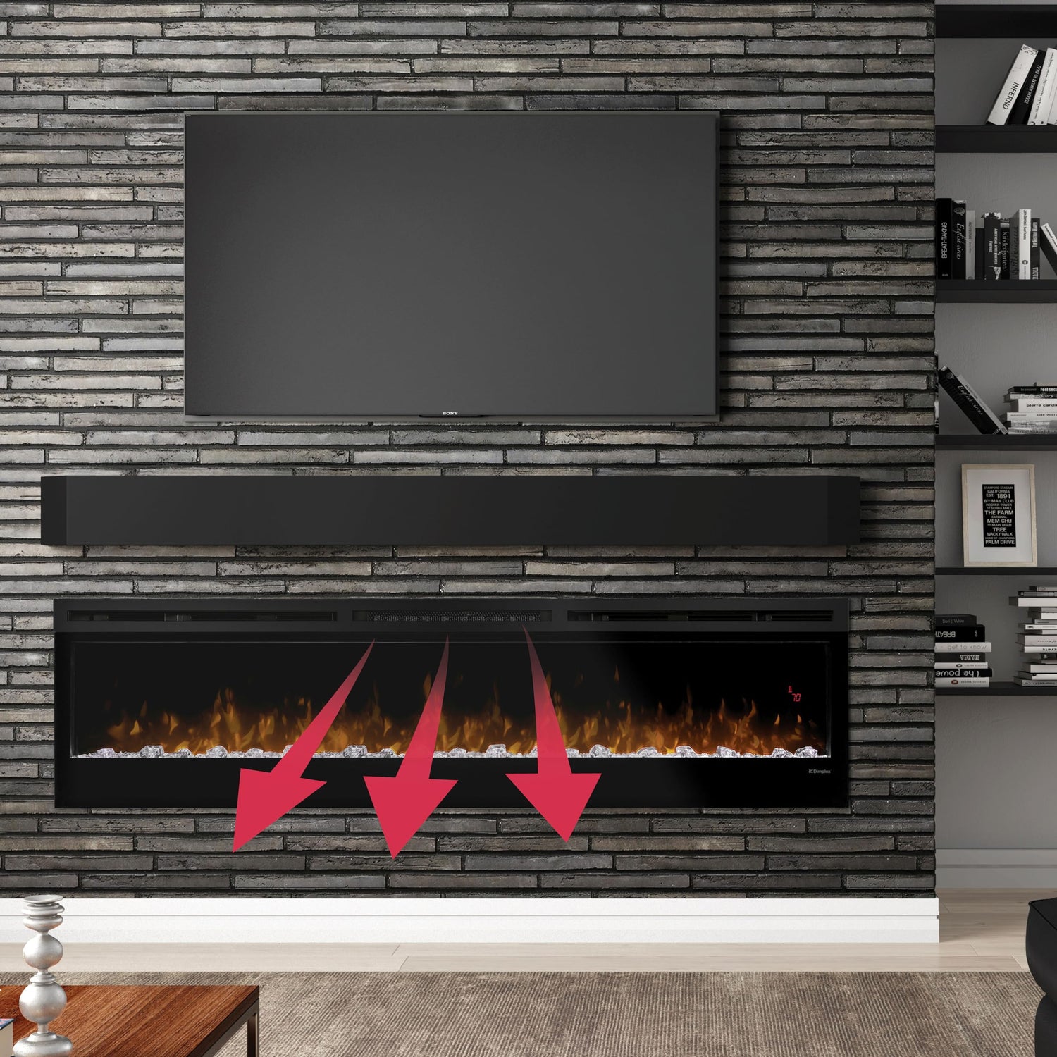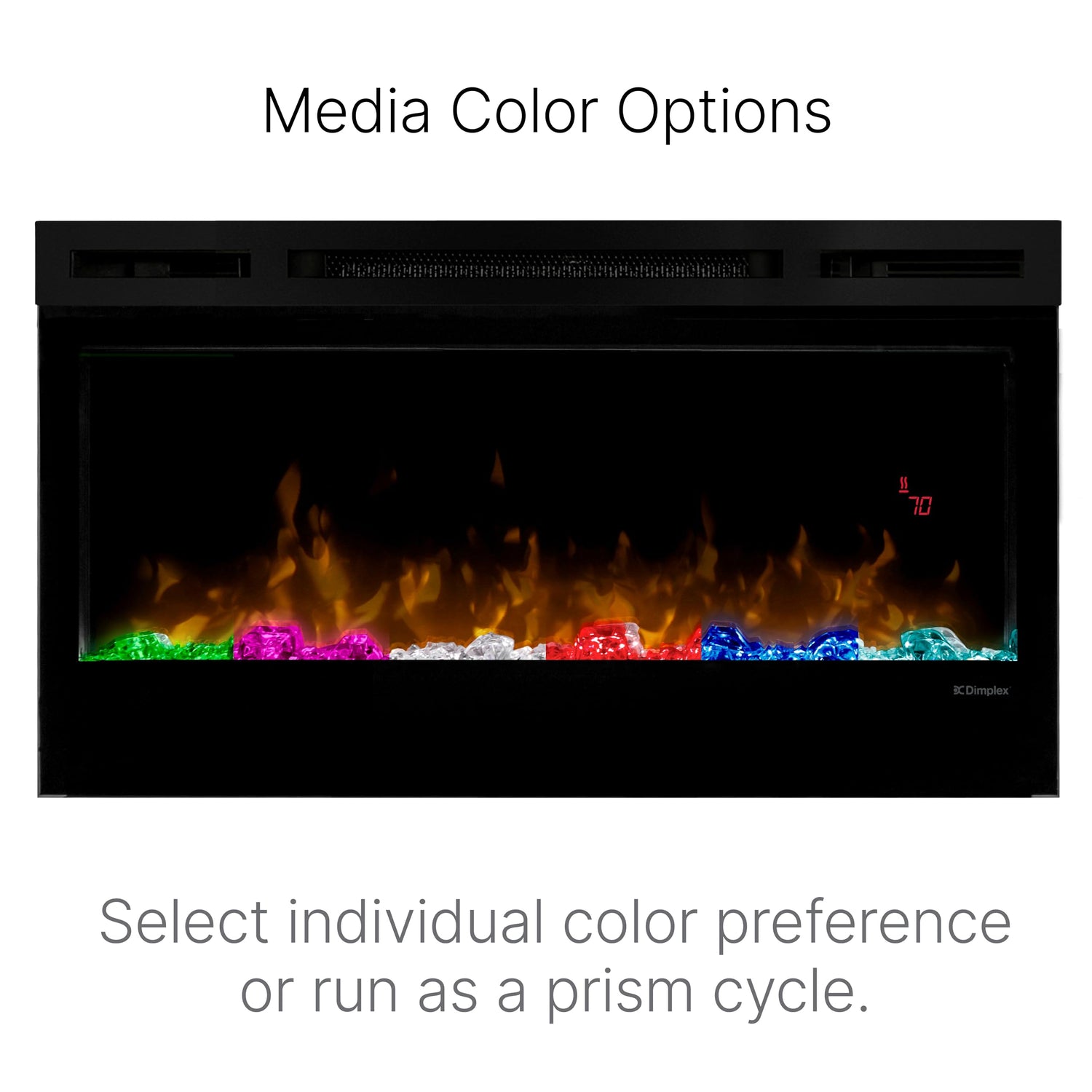 Details: The Dimplex Prism 74" Linear Electric Fireplace combines modern elegance with advanced technology, offering a stunning visual experience that transforms any space. The unique 3D LED flame display illuminates the acrylic ice ember bed with a full spectrum of RGB colors, creating a captivating ambiance. This electric fireplace heater is designed for flexibility, allowing for wall-mounting, fully recessed, or partially recessed installation, making it a perfect fit for any living room, bedroom, or office. Equipped with a powerful heater, the Dimplex Prism warms spaces up to 400 sq. ft., ensuring comfort year-round. Whether you want to enjoy the flame display with or without heat, this fireplace offers the versatility to match your needs. The cool-to-touch glass and multifunction remote control add an extra layer of safety and convenience, making it an ideal choice for families and modern homes. Designed with both aesthetics and functionality in mind, the Dimplex Prism features a sleek black finish and a compact design that fits seamlessly into any space. The fireplace's RGB color themes and adjustable ember bed colors allow you to customize the look to match your decor. Plus, the ability to plug into a standard 120V outlet ensures a hassle-free setup. Whether you're looking to add warmth to your living room, create a cozy atmosphere in your bedroom, or enhance your office with a touch of modern elegance, the Dimplex Prism Electric Fireplace is the perfect solution. With its advanced LED technology, versatile installation options, and powerful heating capabilities, this indoor fireplace is a must-have for anyone seeking style and comfort in one package. Product Details: (1) 74-Inch Electric Fireplace (1) Acrylic Crystal Ember Bed (1) Remote Control Material: Steel, Glass Dimensions: 19.5"H x 7.3"D x 74.25"W