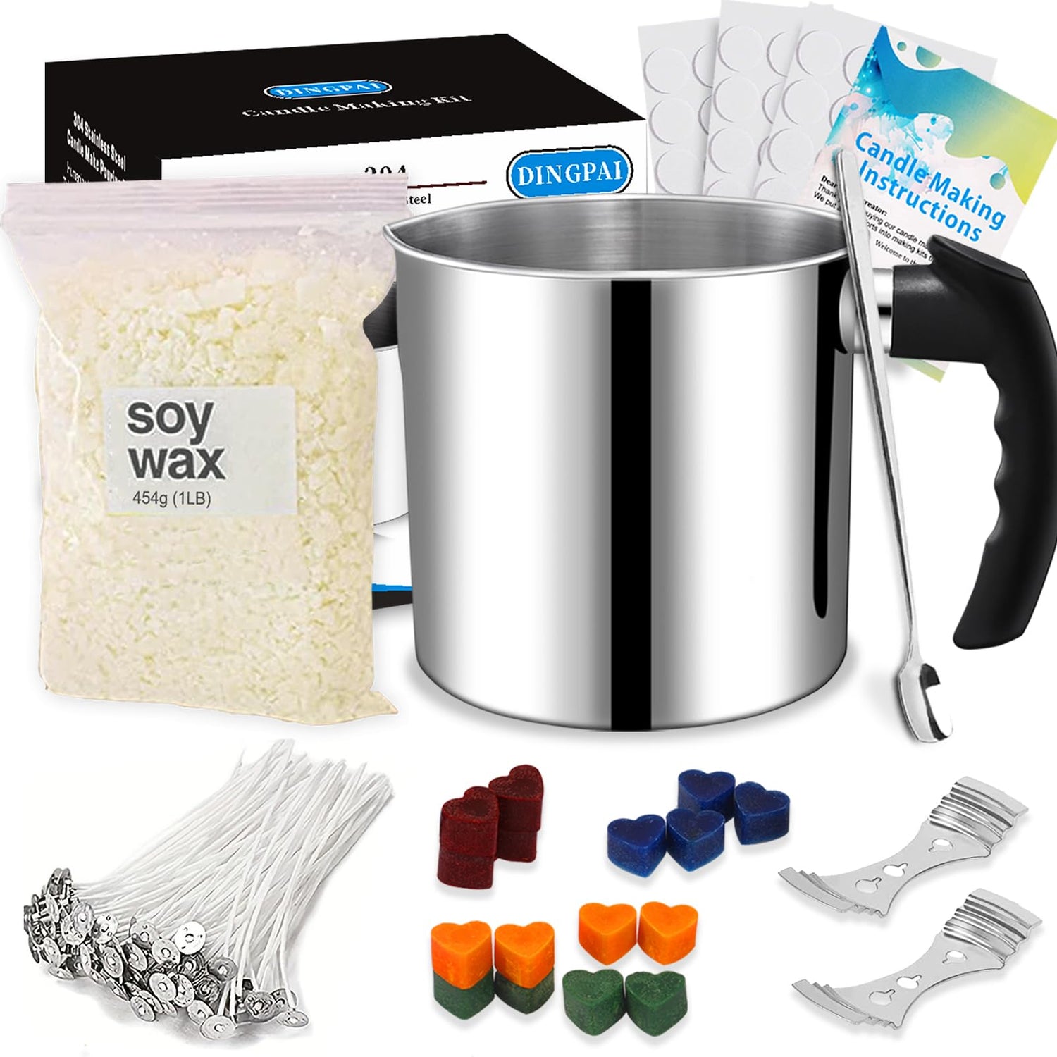 DINGPAI candle making supplies includes 1300ml candle make pouring pot, 1BL soy wax, 50 Candle Wicks, 50 candle wicks sticker, 2 Candle Wicks Holder, 4 candle wax dye, 1 spoon,1 Production Instructions.