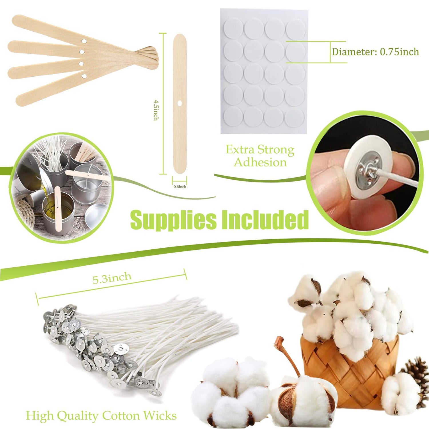 - PREMIUM SOY WAX CANDLE MAKING SUPPLIES: Our candle wicks use 100% cotton, which is smooth burn and lead-free, so there is no disgusting smell or black smoke. Our white round stickers, made of double-sided foam and adhesive, with super adhesion, is very suitable for fixing the wick at the bottom of the candle container. Our wooden candle wick centering devices are made of pure natural wood, sturdy, durable and safe, which will make your DIY homemade candles easier.