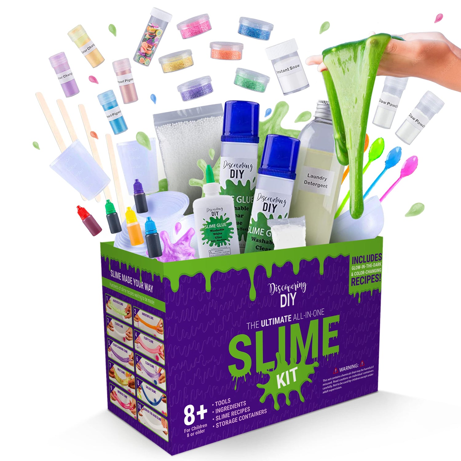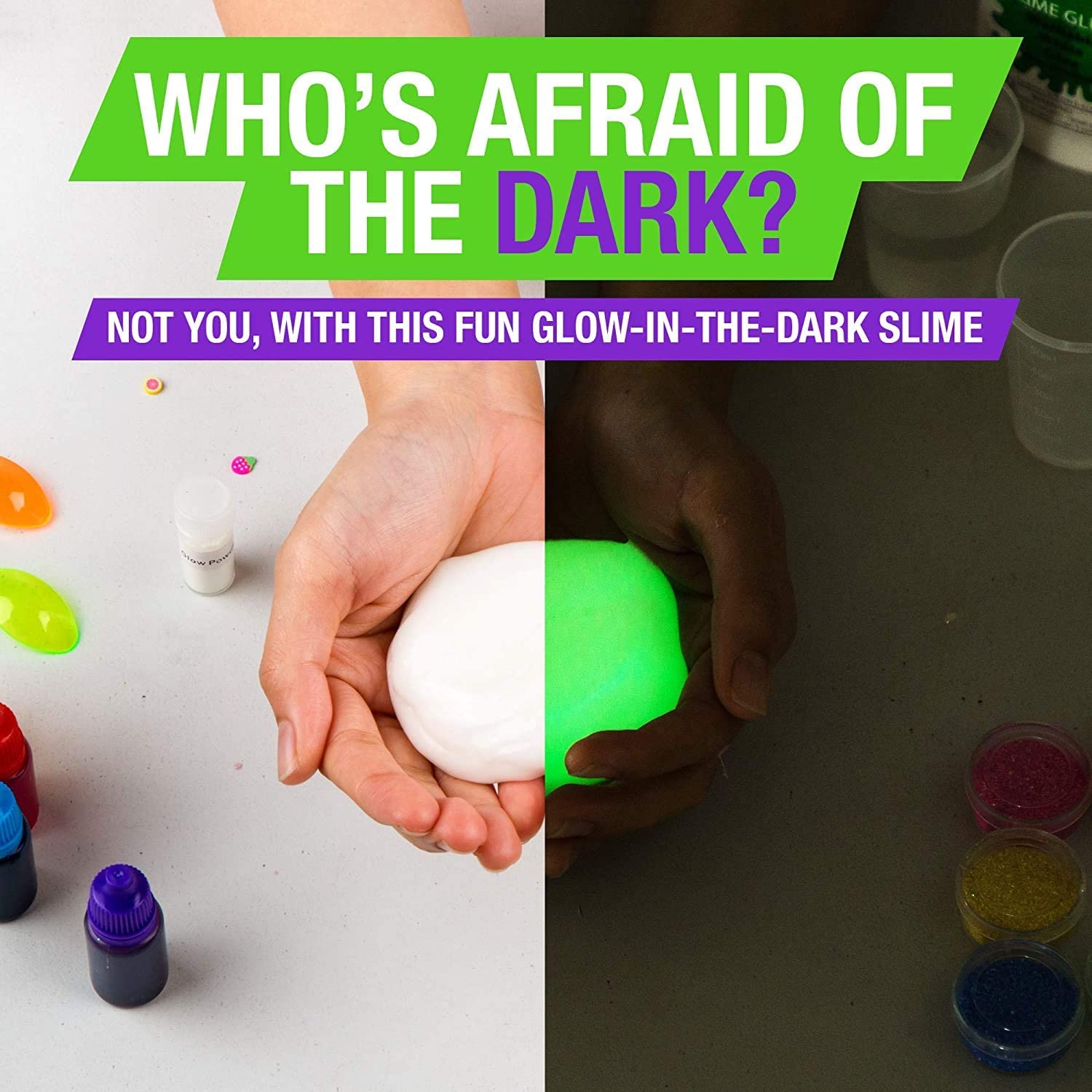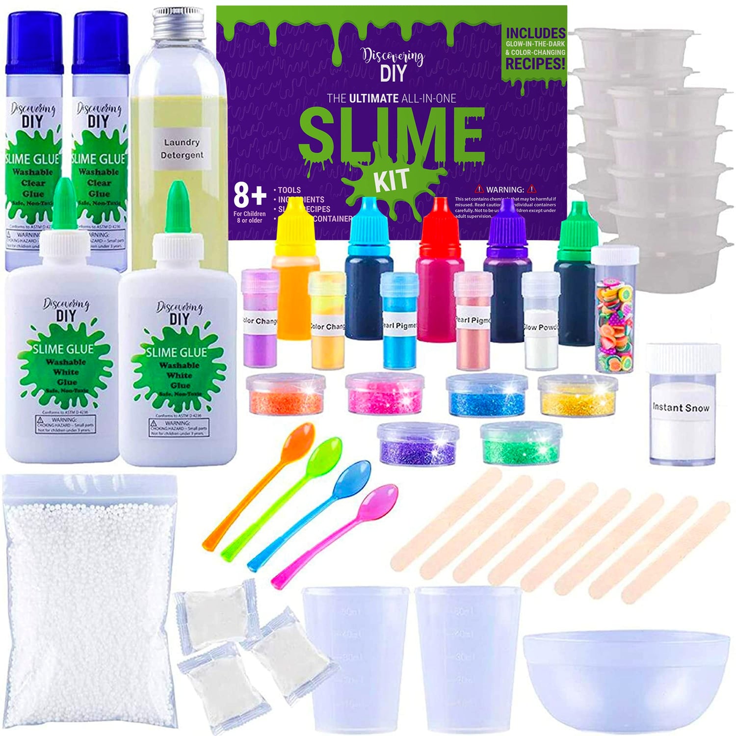 - ALL-IN-ONE - Fun starts here! Our slime kits include glitter, glue, glow in the dark and color changing powder, beads, food coloring, clay, a mixing bowl, sticks, spoons, plastic fruit, and instructions.
