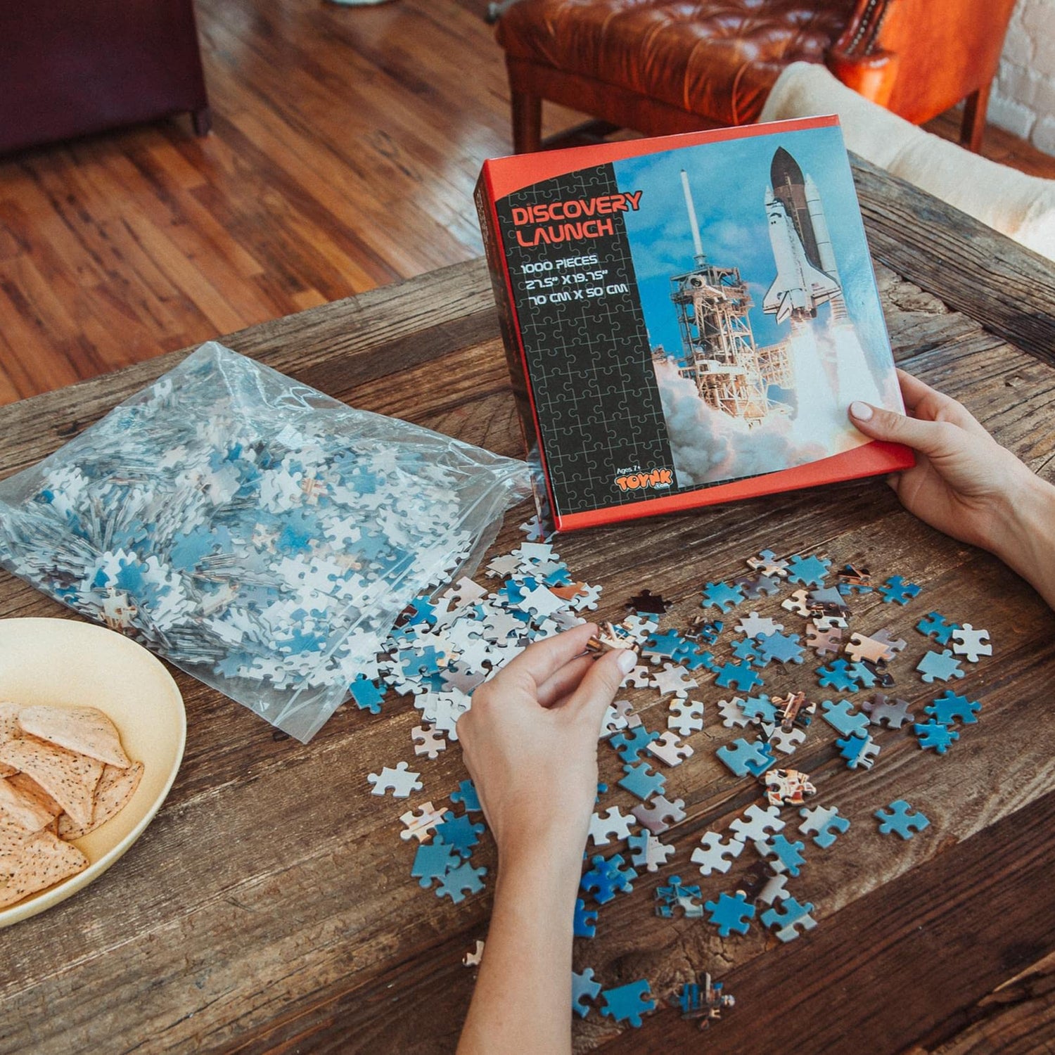 Details: THE ULTIMATE PUZZLING CHALLENGE Countdown and blastoff into orbit with this epic NASA Discovery Launch Space Puzzle. Measuring approximately 29 x 20 inches, this 1000-piece jigsaw puzzle features one of the space agency's historic missions. As you assemble the puzzle piece by piece, you will reveal the Discovery orbiter's iconic takeoff into space as it prepared to break through the Earth's atmosphere. THE PERFECT FIT The perfect way to pass the time, you can enhance your intellectual prowess through a hands-on learning experience with this fun puzzle challenge. Made from 100% recycled puzzle board material, the premium construction provides a top-quality building experience. The precision-cut jigsaw pieces are designed to snap easily into place, ensuring a tight interlocking fit. Bring the whole family together and host a fun game night experience with this challenging jigsaw puzzle, or test your own skills by completing it alone. Whether you choose to make it a solo or group activity, you can be sure that you will enjoy hours of fun-filled entertainment.
