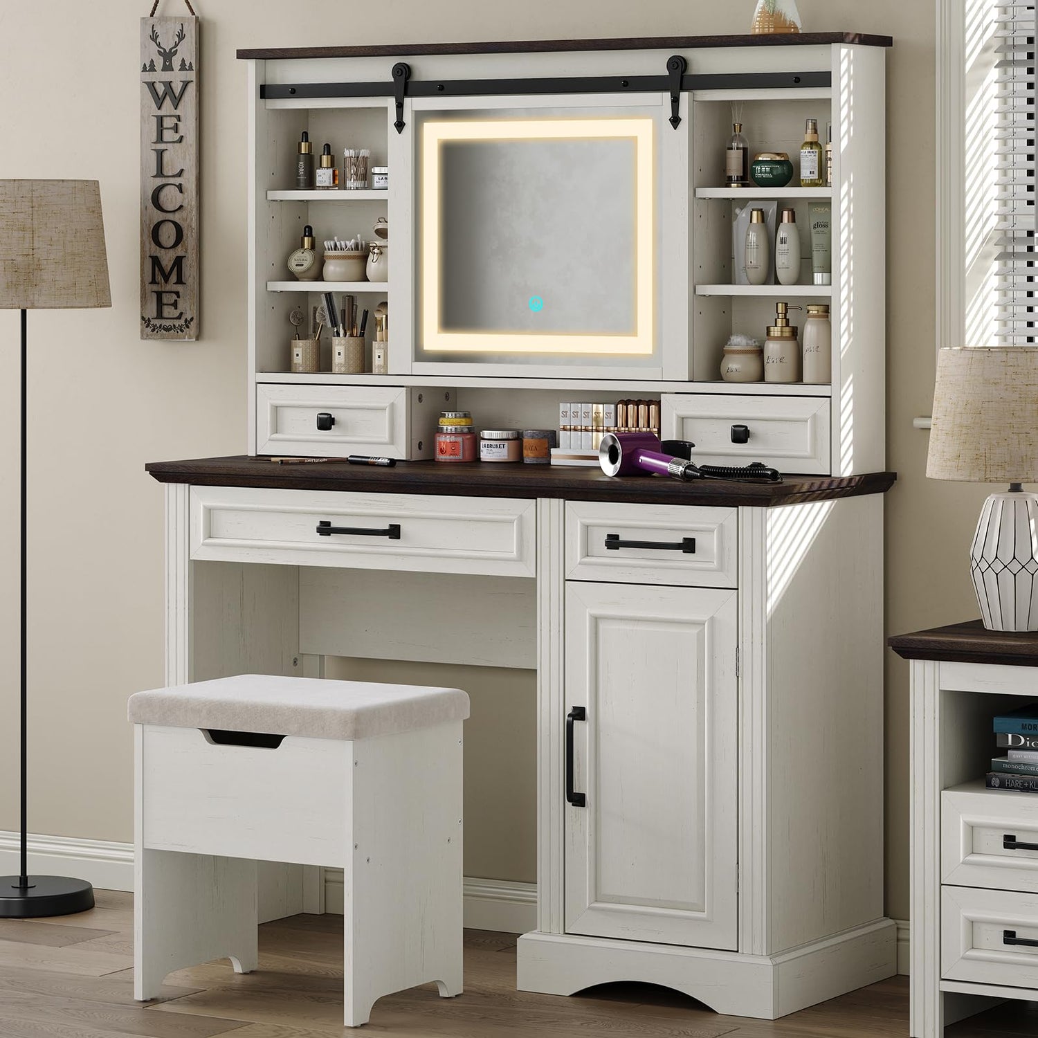 Diwnnue Farmhouse Makeup Vanity Desk with Sliding Mirror, Large Vanity Set with 3 Brightness Lights, Ample Storage, Antique White