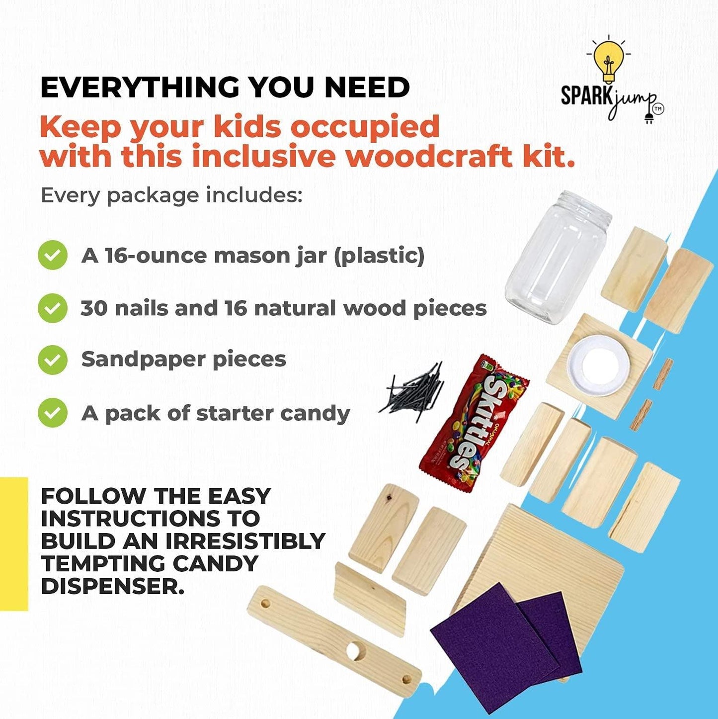• EVERYTHING YOU NEED: Keep your kids occupied with this inclusive woodcraft kit. Every package includes a 16-ounce mason jar (plastic), 30 nails, 16 natural wood pieces, sandpaper pieces, and a pack of starter candy. Follow the easy instructions to build an irresistibly tempting candy dispenser.