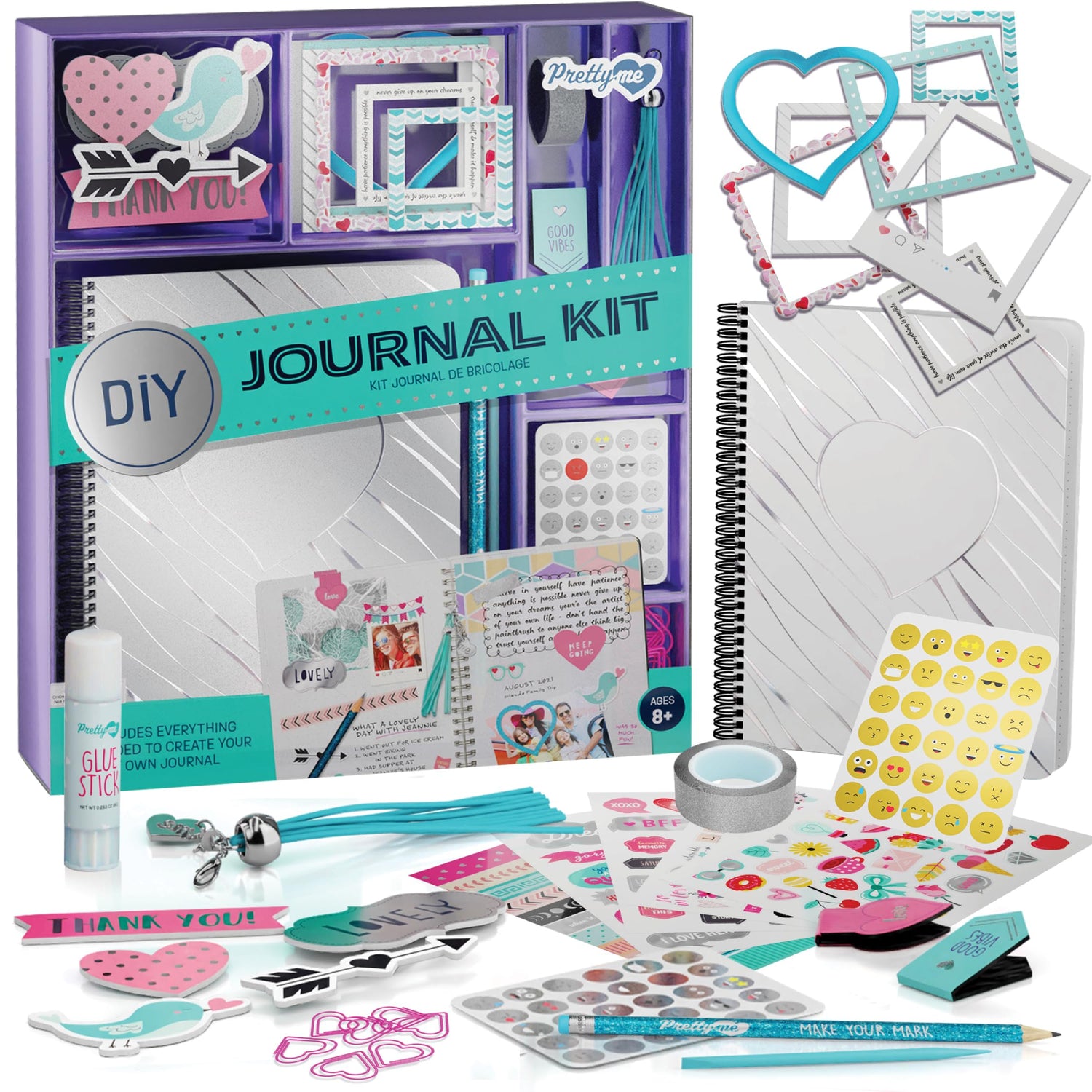 - Mega Set: Includes: 70-page Journal Spiral (6 x 8"), Decorative Tassel with Charm, 4 Heart-Shaped Paper Clips, 7 Picture Frames, Glittery Tape, Glue Stick, 2 Magnetic Bookmarks, 5 Sticker Sheets, 8 Scrapbook Art Sheets, 5 Decorative Cardboard Cut-Outs, Foil Transfer Sheet, Stylus, Pencil, Instruction Guide, Storage Box.