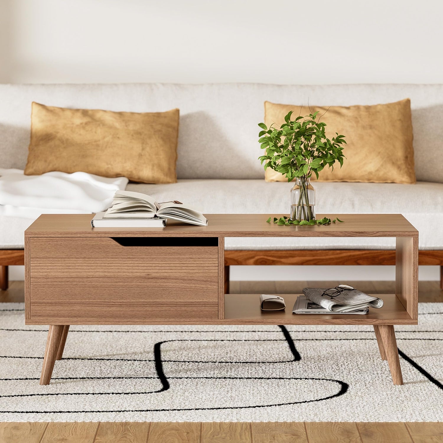 DIYART Brown Coffee Table, Mid Century Modern Coffee Table with Drawer & Shelf, 39'' Wooden Simple Console Table for Living Room