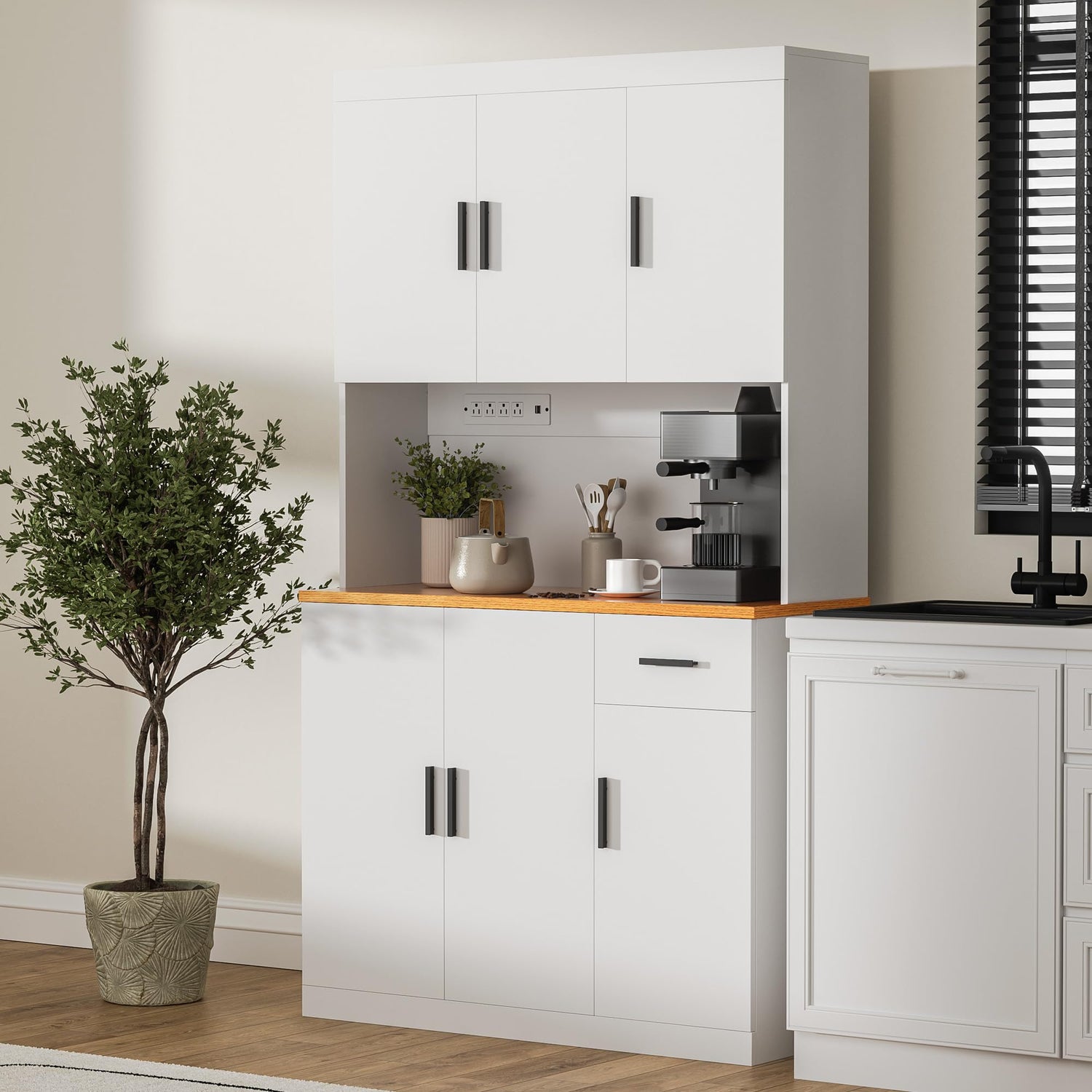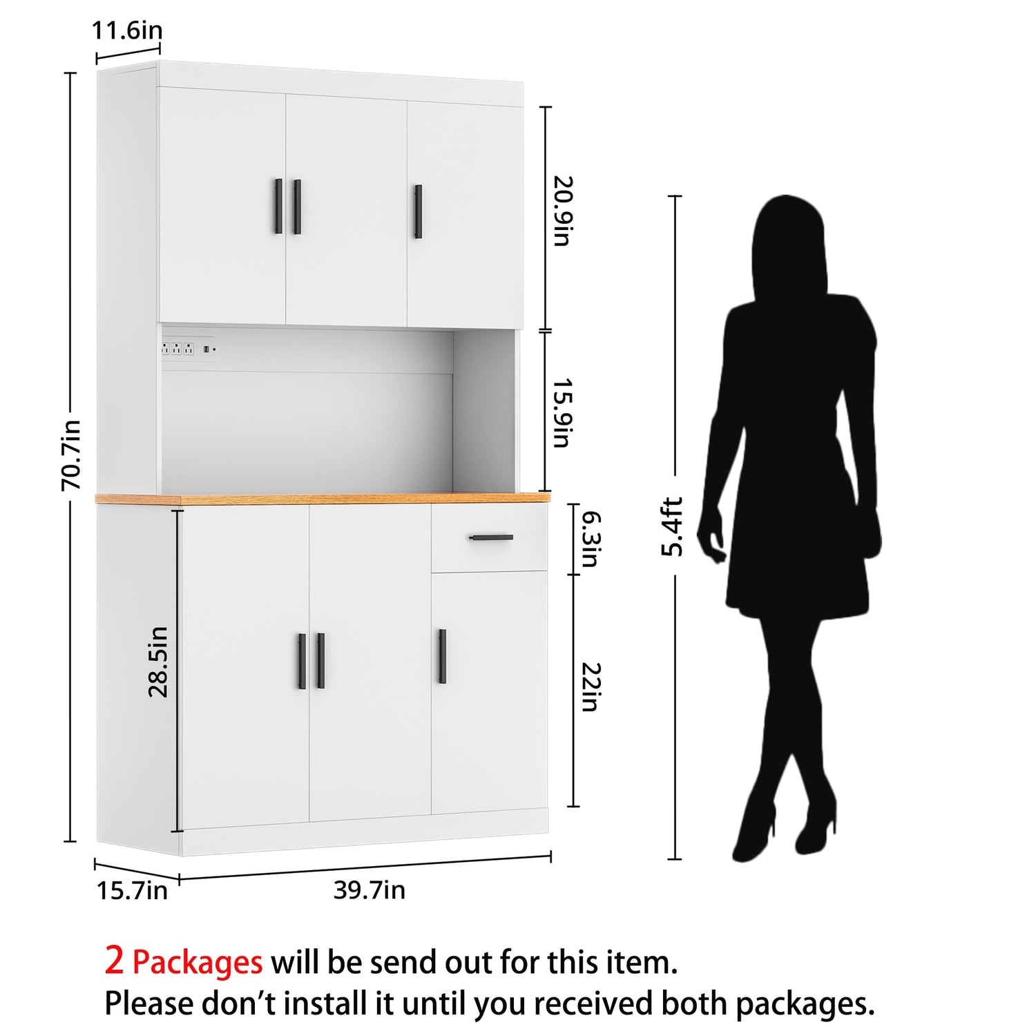DIYART White Kitchen Pantry Cabinet, 71" Tall Kitchen Storage Cabinet with Power Outlet, Freestanding Kitchen Hutch with countertop
