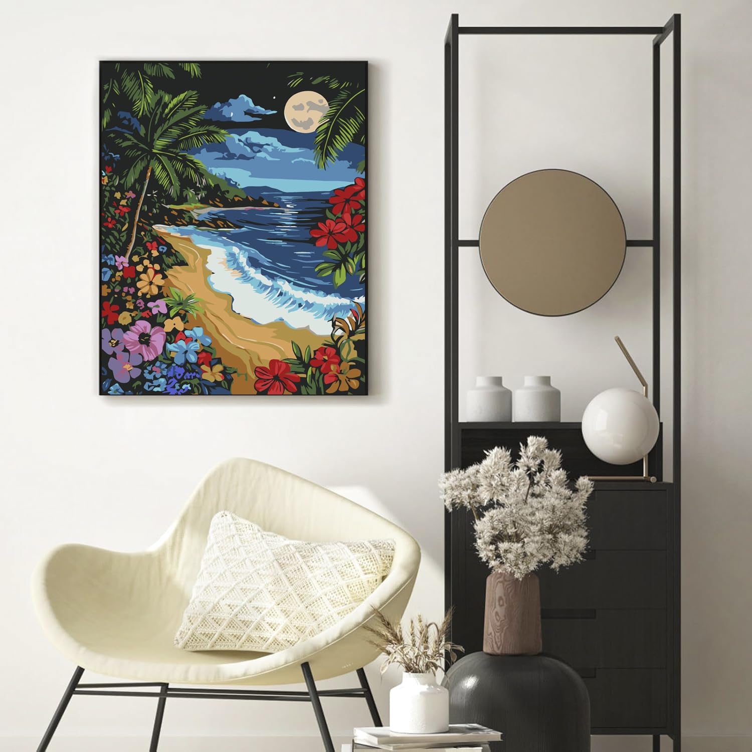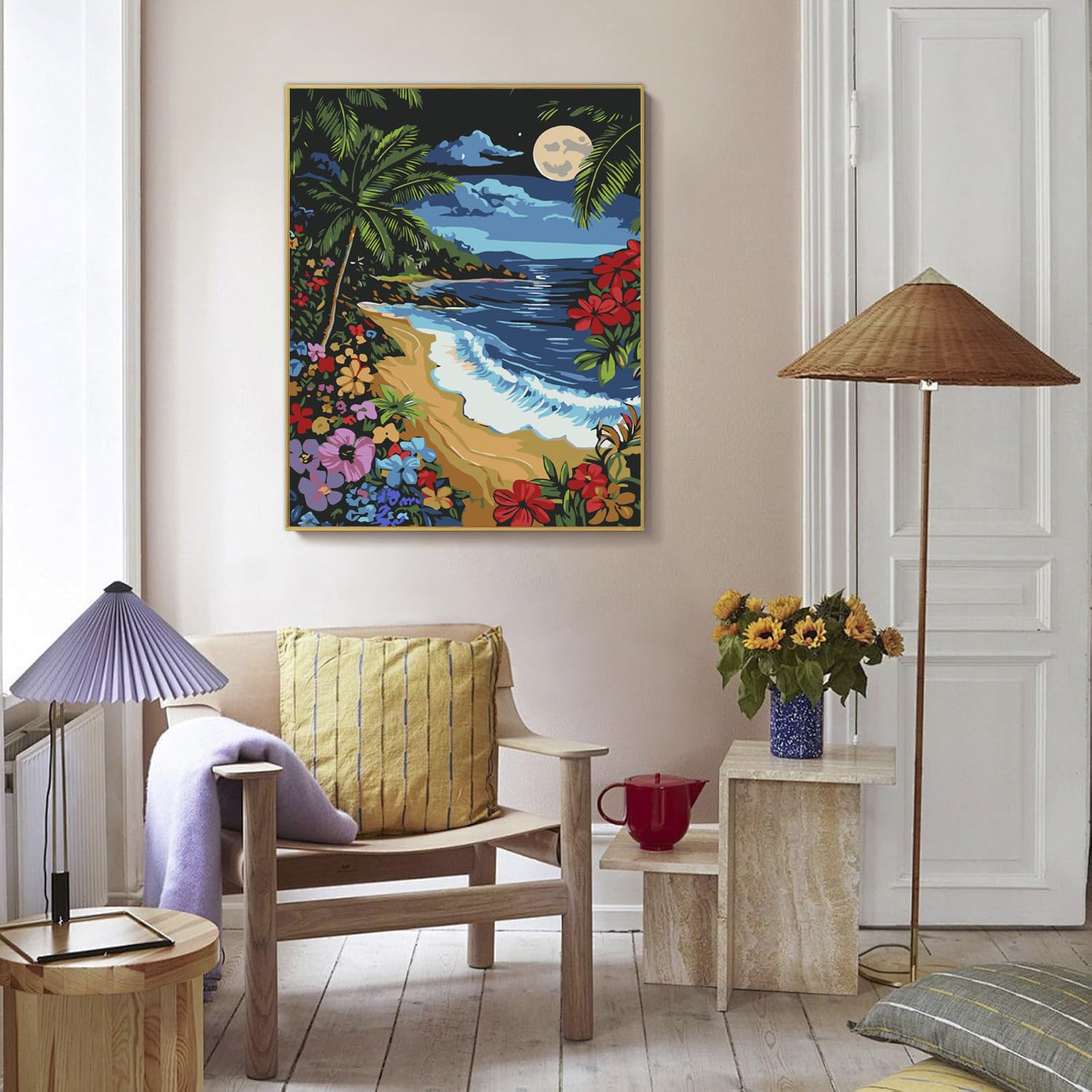 - Adult Paint by Numbers made of high definition printed canvas which can prevent eyestrain and make oil painting easier.The clear printing make the whole painting process vivid,fan and easy. Very suitable for beginners starter .The landscape paint-by-number kits provide a creative outlet to express oneself and produce beautiful artwork.Turn your leisure time into a creative escape with our captivating moon beach paint by number