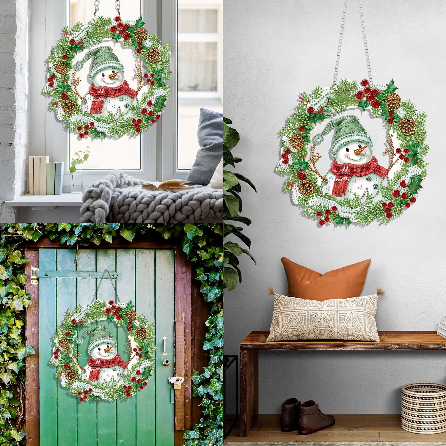 - A cheerful snowman with a red scarf smiles within a wreath of pine, berries, and cones. Joyful winter spirit shines through, perfect for diamond art creation. Spread happiness!