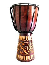 Details: A perennial favorite among music lovers, the Djembe drum, has become very popular in the Western music world. Played with with bare hands slapping the goat skin drum head, it produces a rich, vibrant, resonating sound. Handcarved from a single piece of local hardwood and enhanced with a traditional carvings, this drum is sure to please any music lover. We carry an assortment of these drums and since each piece is hand carved designs and color of the trbal motif may vary. The drum you receive may differ from the picture. Materials: Wood & Goatskin Handmade - Please allow for minor variations. Tribal Motif may vary from picture. Dimensions- 16"H x 9"W - Drum Head is approximately 7.5-8"
