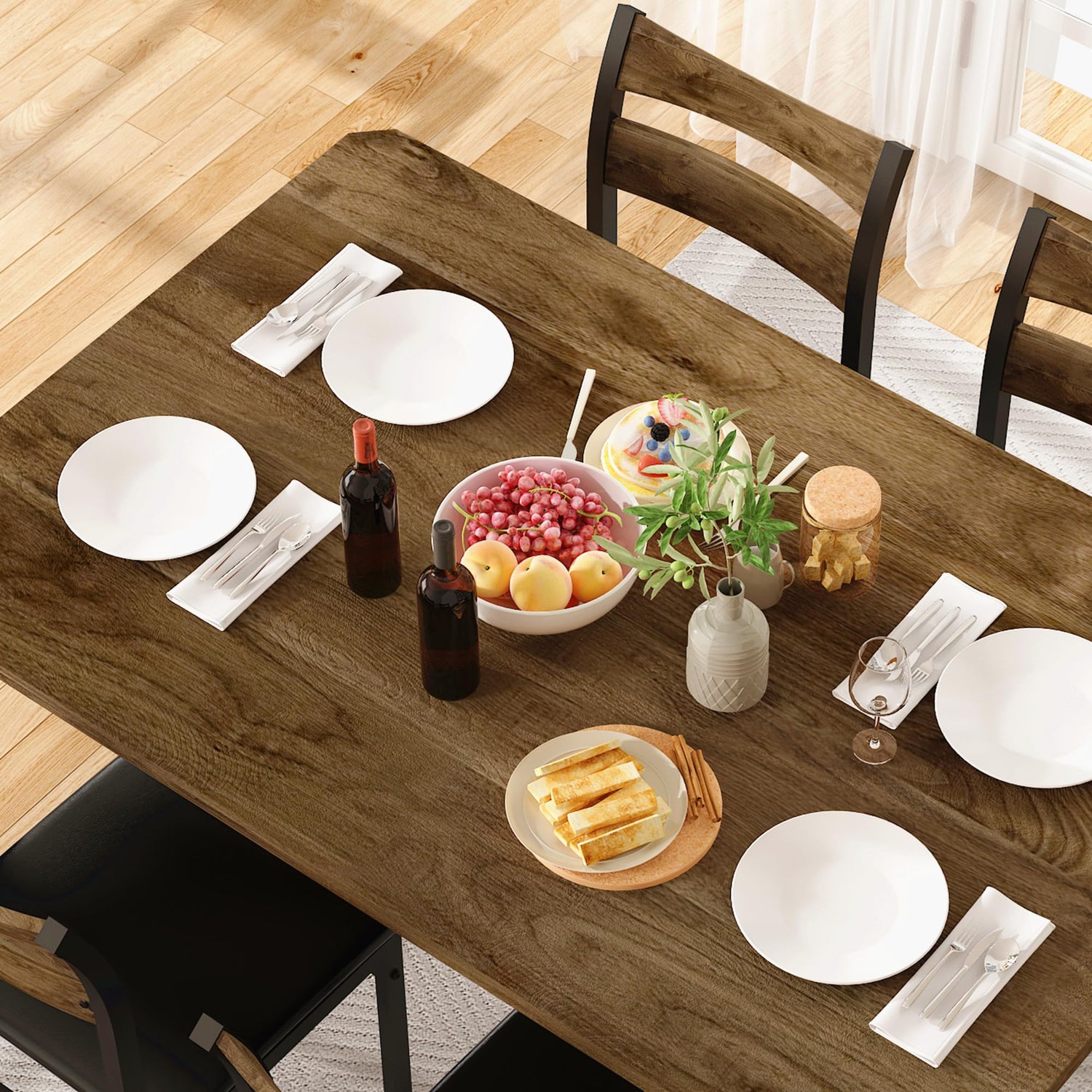 - 【Stunning Design】Modern Dining Table Set for 4: The wooden boards applied to the kitchen table and chair set have a realistic wood grain, so it adds an idyllic and natural atmosphere to the space. In addition, the wooden backrest of the chair has a special design, with both ends protruding inward, adding a bright spot. This 5 pieces dining table set is mainly brown and black, which is very suitable for matching different home styles.