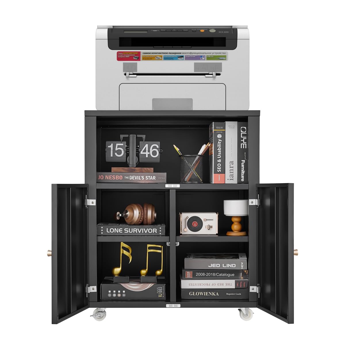 DKYNDSYN Metal Printer Stand with Storage Mobile File Cabinet on Wheels with Doors and Adjustable Shelf Rolling Printer Table Cart for Home Office Small Spaces Under Desk Printer Cabinet (Black)