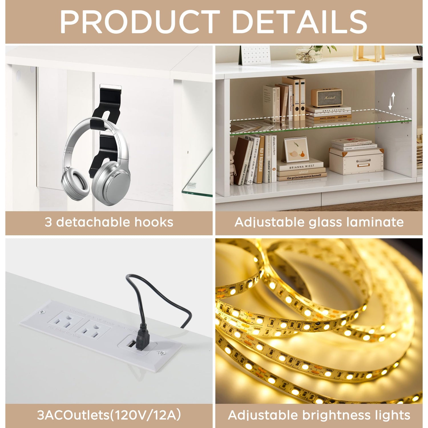 • 🔄 Adjustable & Spacious Storage – Includes a 5mm tempered glass shelf with 3 adjustable heights for consoles, soundbars, or decor. 2 game controller hooks + 1 headphone hook (matte black) keep accessories organized.