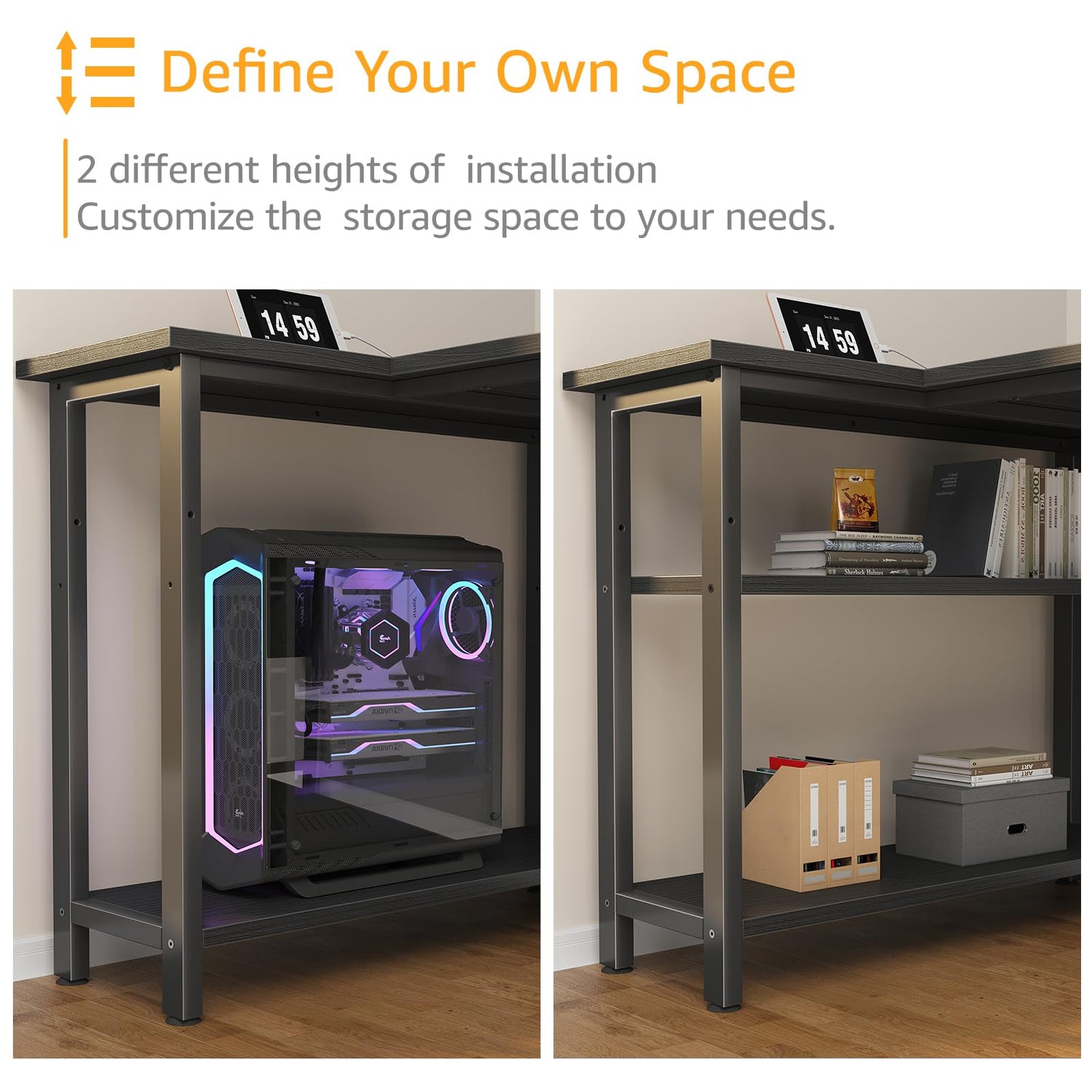 - Modern Simple Style Design: Computer desk with 2 storage shelves, you can try this two installation methods (left or right), and have two different heights of installation, you can customize the storage space to your needs. This splice board desk is made of thick P2 particle wood board with scratch-resistant, anti-collision and waterproof, protect home office desk surface from daily wear and tear.