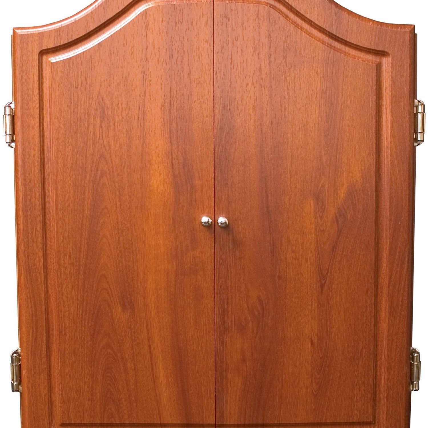 The cabinet not only hides your board from view when you're not playing and protects your wall from errant darts when you are, but also looks great amidst both traditional and modern design furnishings. The cabinet, which measures 19 by 20 by 2.75 inches when closed (W x H x D), is covered by a one-year warranty against defects.
