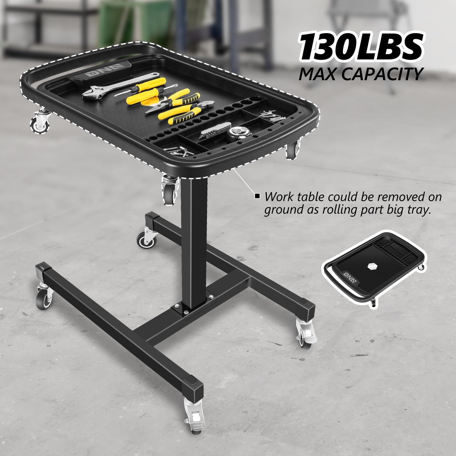 DNA MOTORING 2 in 1 Working Table - Adjustable Height 30.5'' to 47.2'', Rolling Part Tray with 4 Rollers, Portable Work Bench with 2 Brake Wheels,