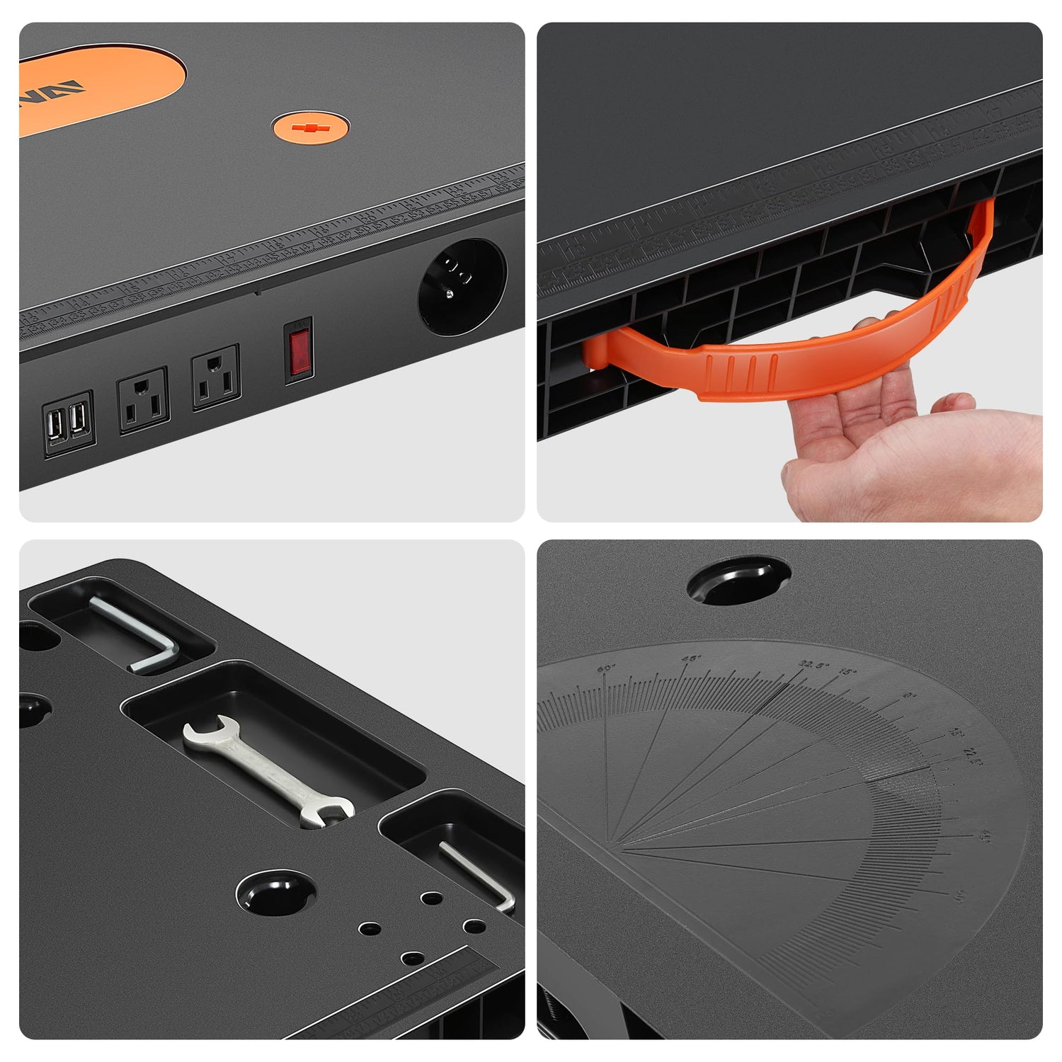 - ALL-IN-ONE HOUSEHOLD & DIY WORK STATION - Design Features a tool tray, vice peg, quick clamp connection, compass, sawhorse hole, ruler(mm/inch), traction rope connection hole and extendable locking legs