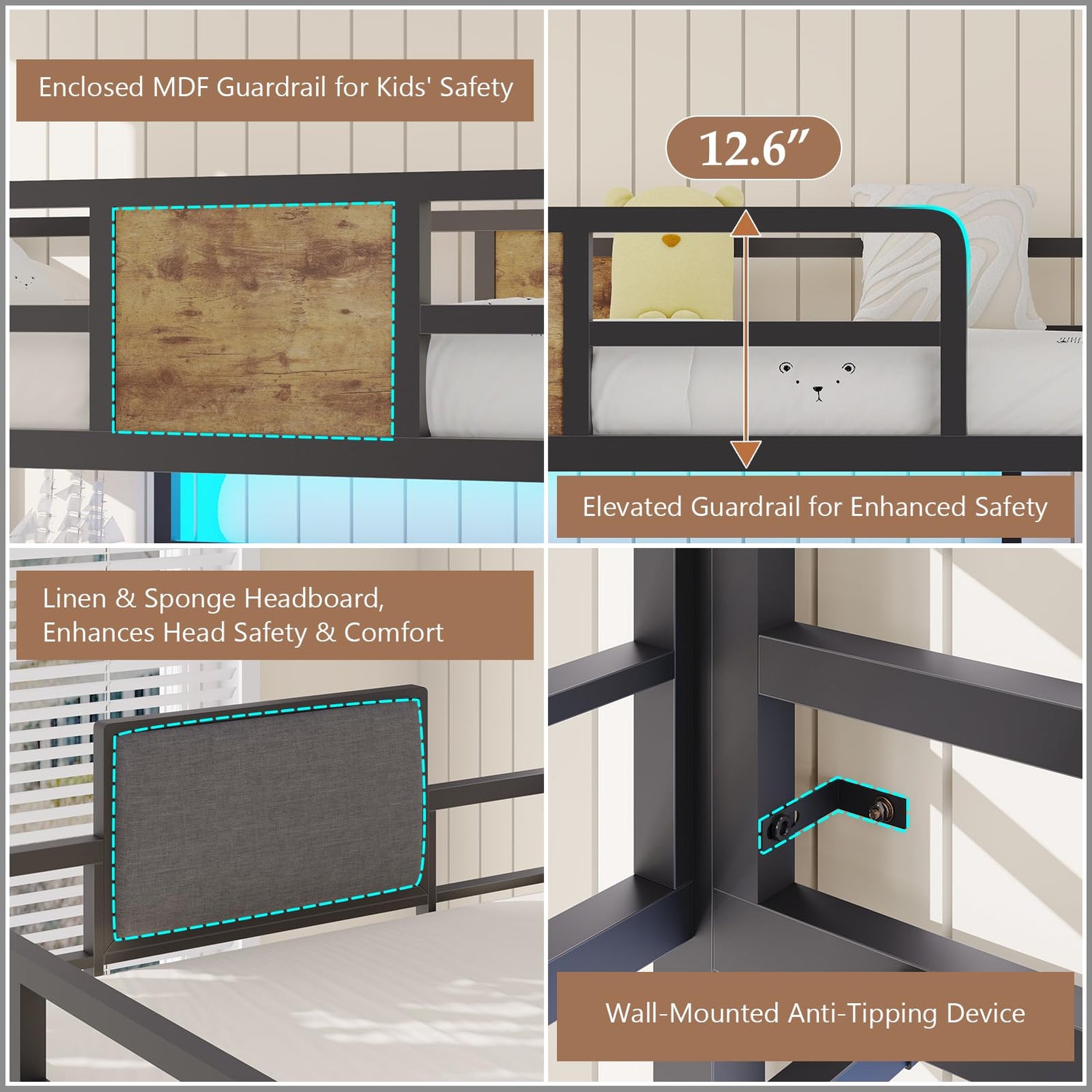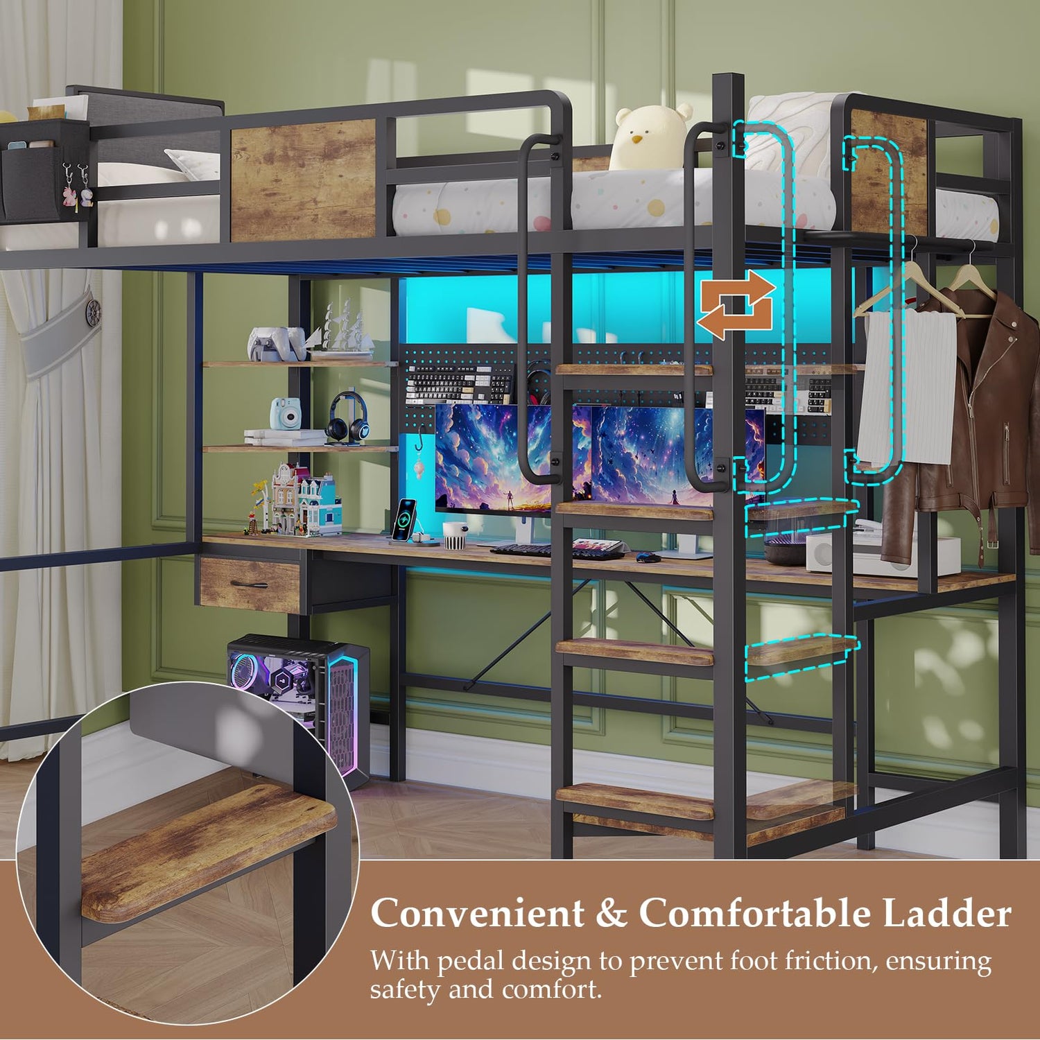 - Loft Bed with Desk Charging & LED Workspace:Stay powered and productive! This loft bed features a built-in charging station (2AC outlet + USB ports+Type-C ports) and LED light , creating the perfect illuminated study zone or hobby area right beside your sleep space